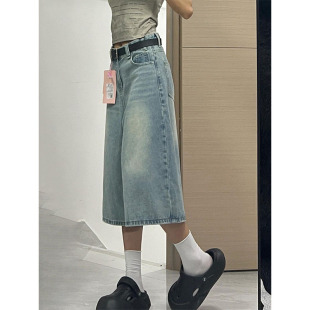 复古高腰宽松阔腿显瘦直筒中裤 新款 女夏季 浅蓝色水洗七分牛仔短裤