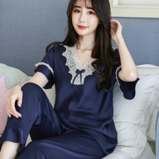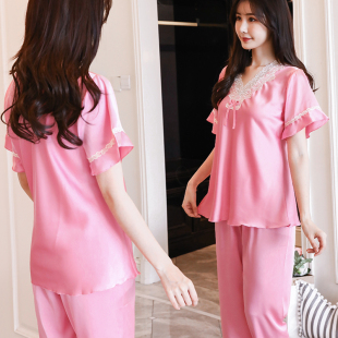 性感两件套装 睡衣女夏款 薄款 冰丝绸夏天可爱女士短袖 夏季 长裤 大码