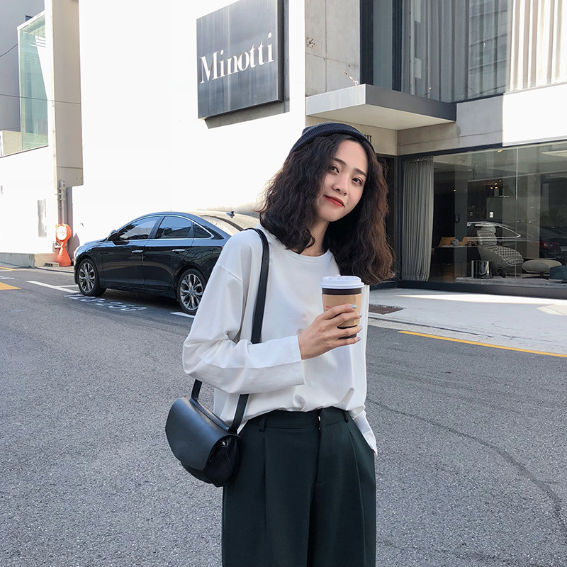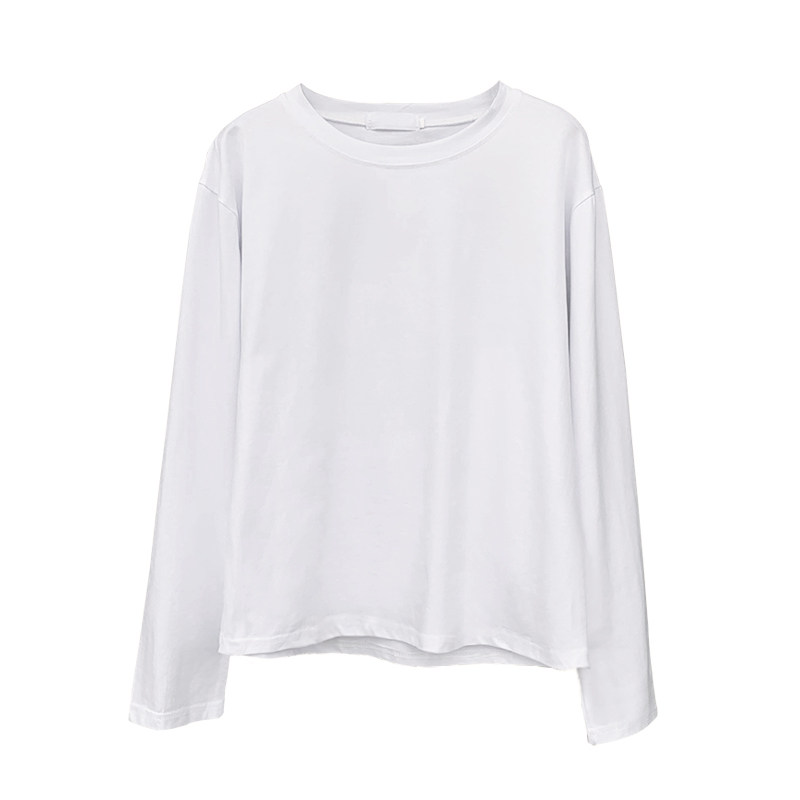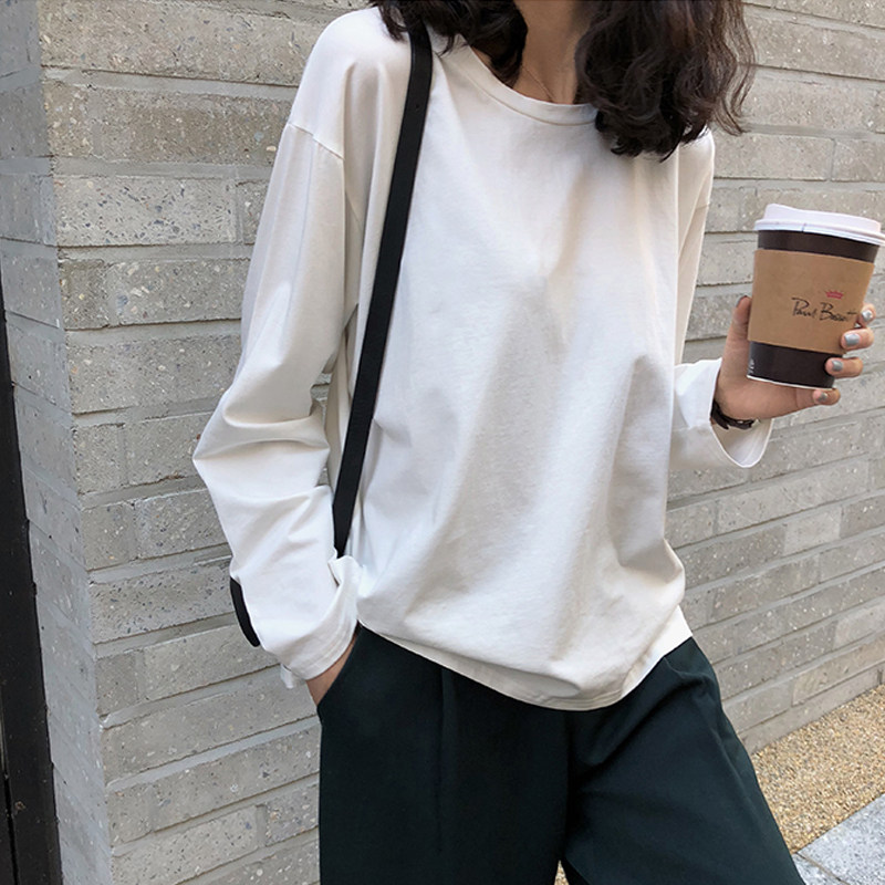 韩版 秋季 打底衫 潮白色纯色棉质长袖 休闲t宽松内搭t恤学生 上衣女装