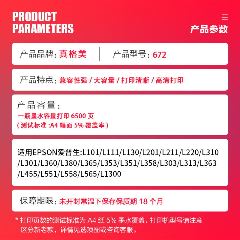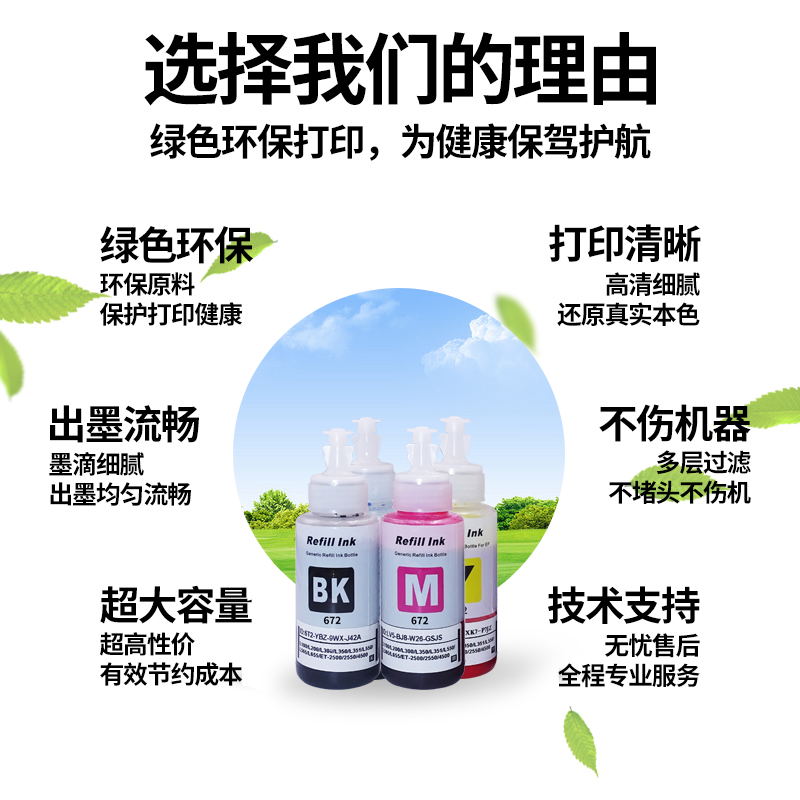 L1300 L383 L310 L301 L365 L380 L351 T6721激光打印机墨水非原装 真格美适用爱普生打印机墨水672 L101 360