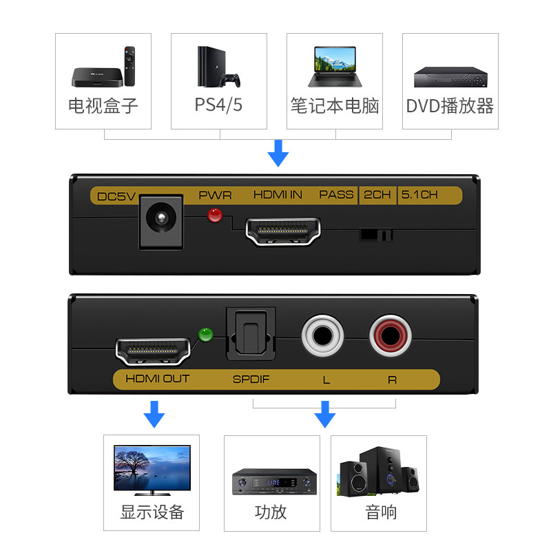 switch接显示器hdr音箱 xbox VPFET HDMI音频分离器4K高清转3.5AUX耳机孔红白左右两声道光纤5.1声道PS5