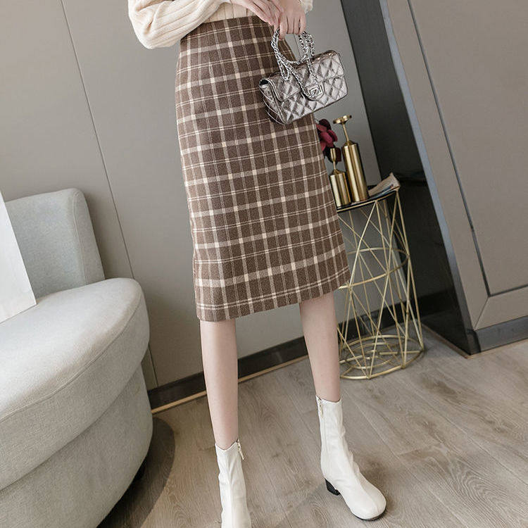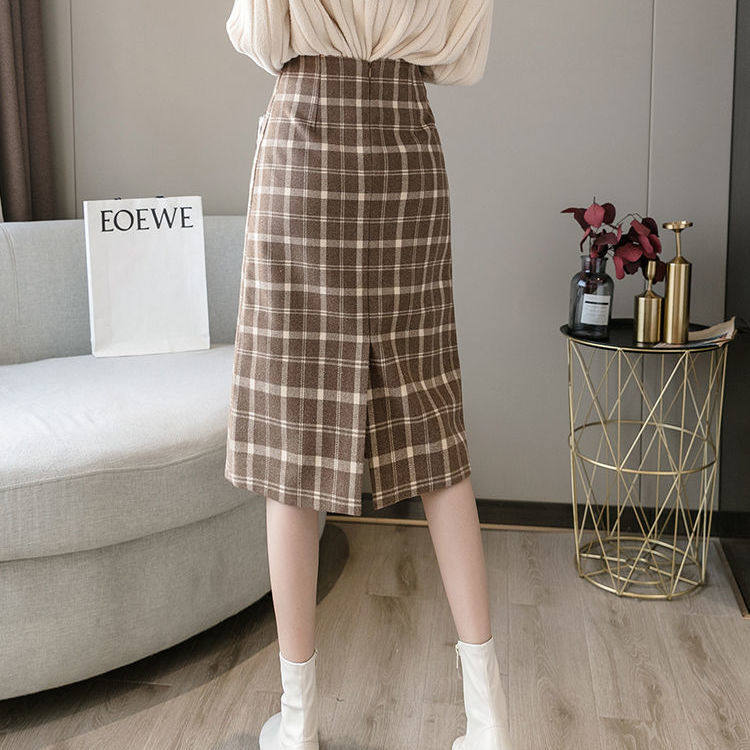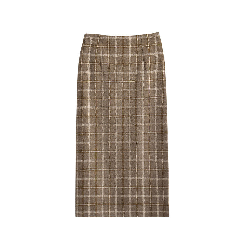 长裙 毛呢遮胯开叉a字包臀一步西装 格子半身裙女秋冬季 高腰中长款