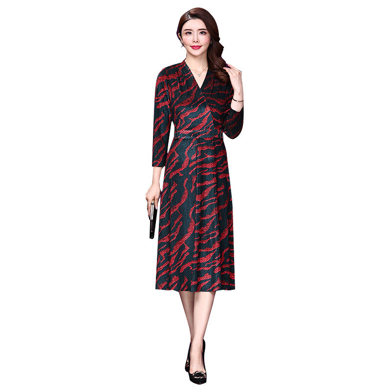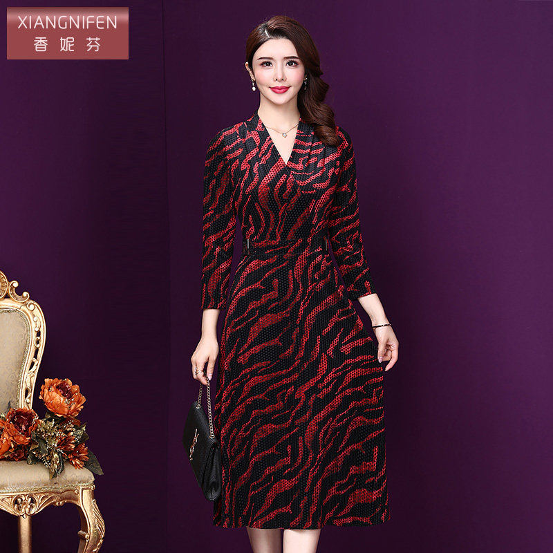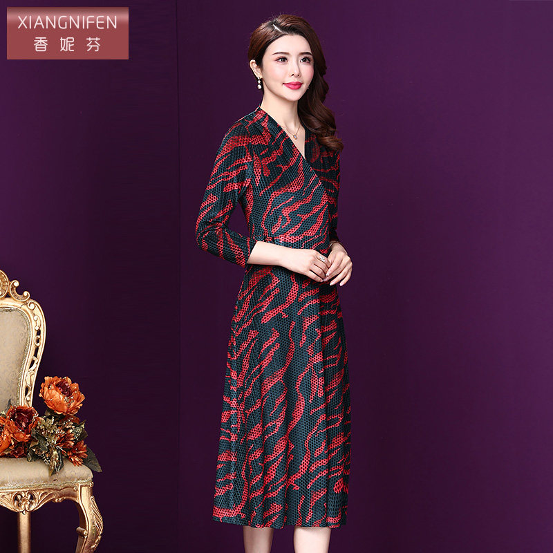 中长款 香妮芬2026春季 连衣裙阔太太气质七分袖 丝绒妈妈装 裙子 新款