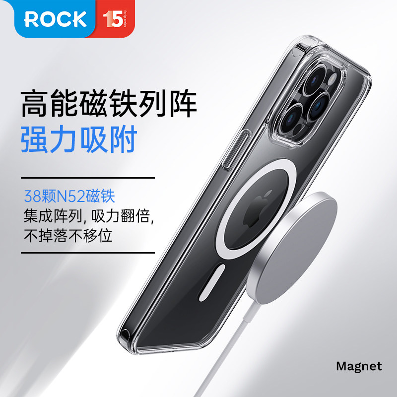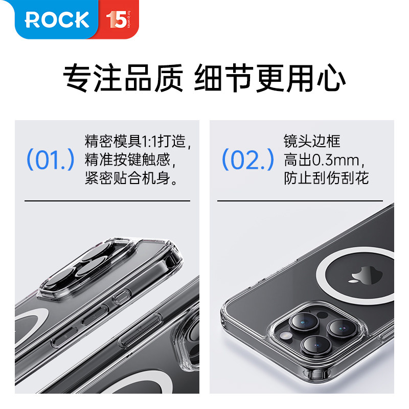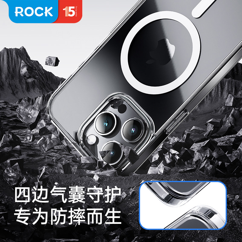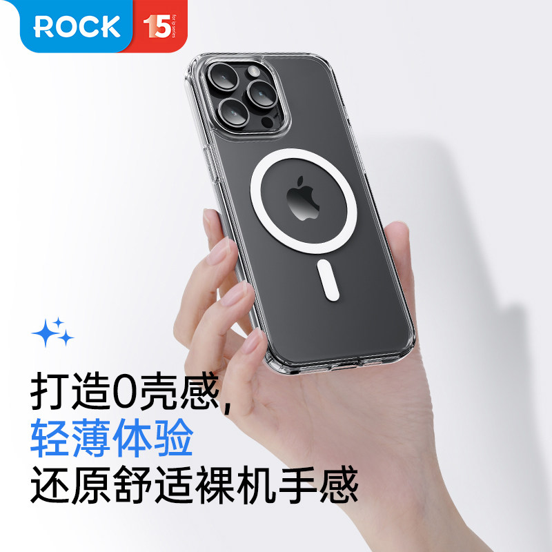 ROCK适用苹果15手机壳透明iPhone15ProMax硅胶磁吸15Pro保护套15plus洛克全包防摔por新款 简约超薄十五女款