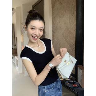 短袖 短款 T恤女小飞袖 韩系气质修身 上衣 夏季 pusumede撞色U领针织衫