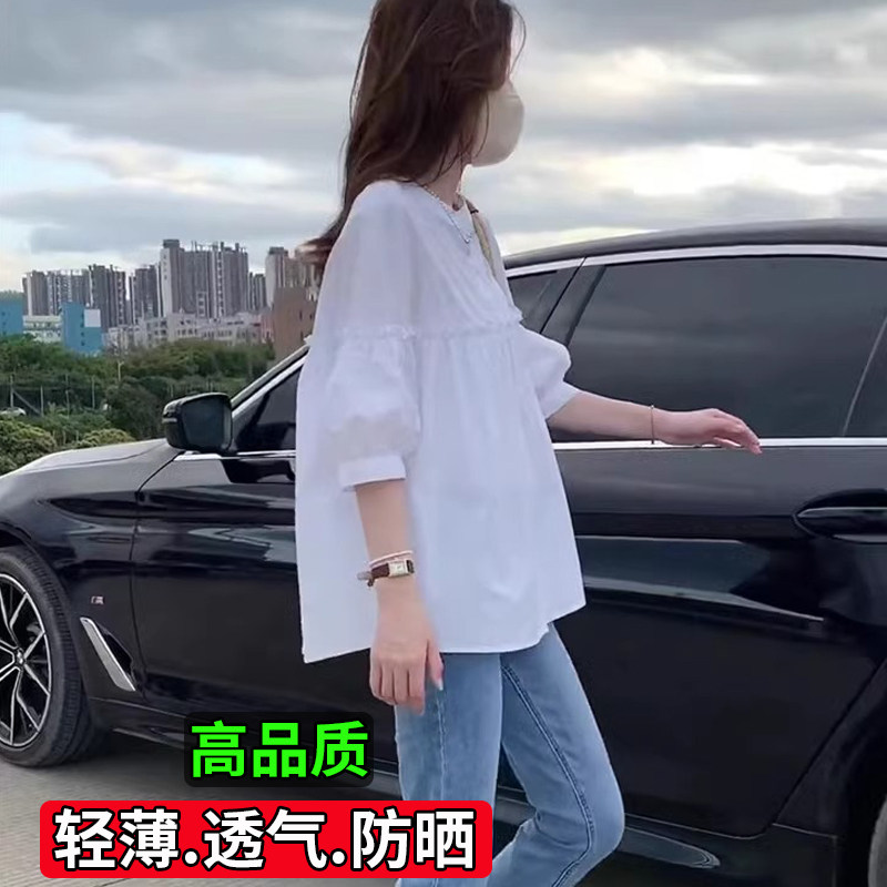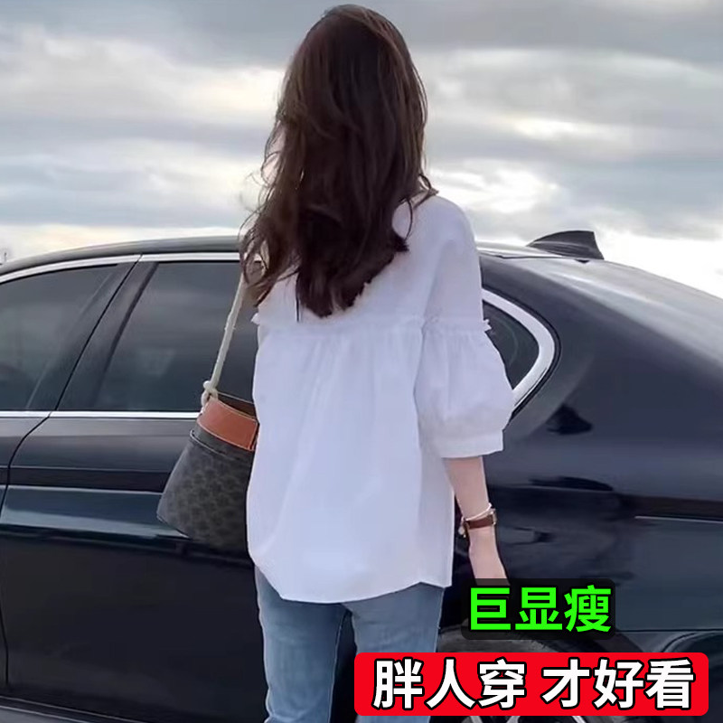 薄款 大码 高级感上衣别致漂亮小衫 女夏法式 胖mm宽松遮肚子白色衬衫