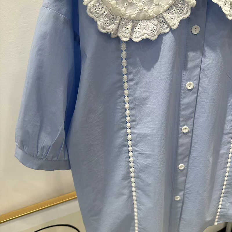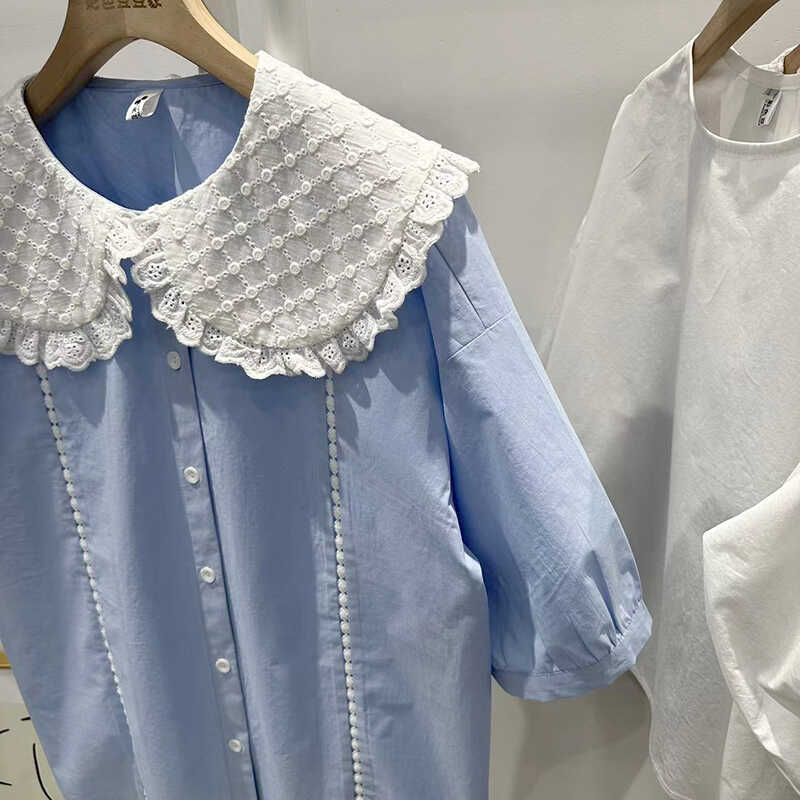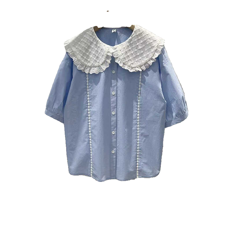 上衣有大码 夏季 蓝色棉衬衫 设计感小众法式 娃娃领衬衣女短袖