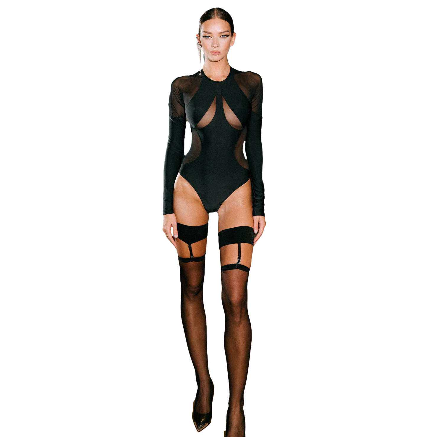 连体衣women 2024新款 性感透视网纱拼接修身 圆领长袖 clothes 女装