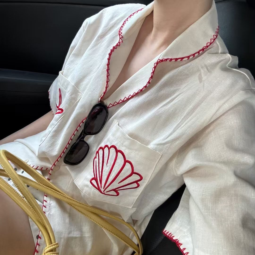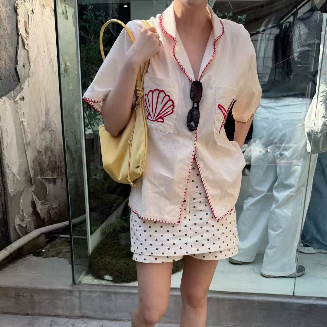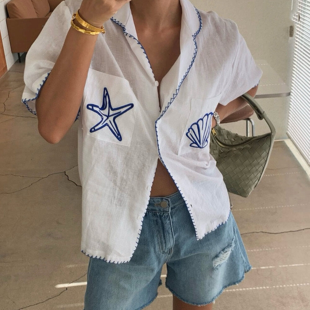 韩国东大门翻领撞色手工缝线刺绣贝壳海星宽松休闲棉麻短袖 女 衬衫
