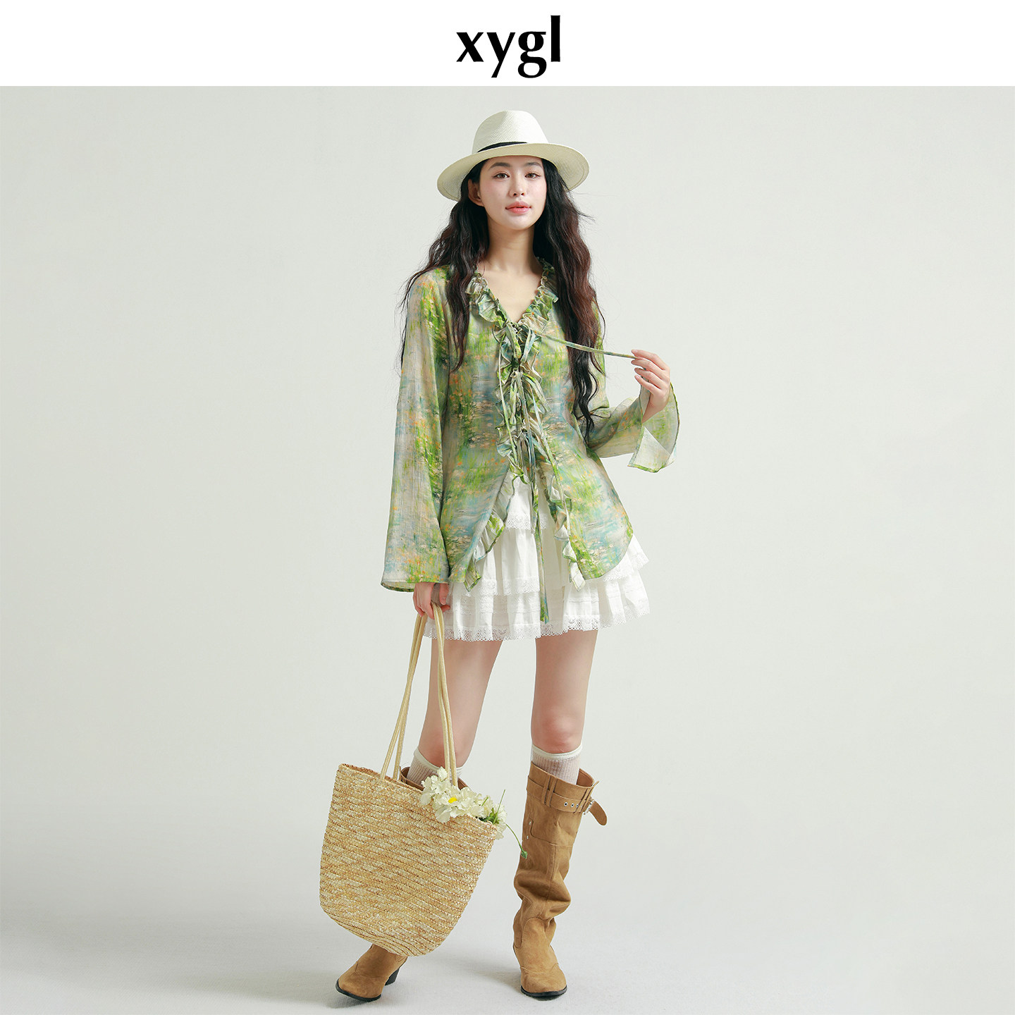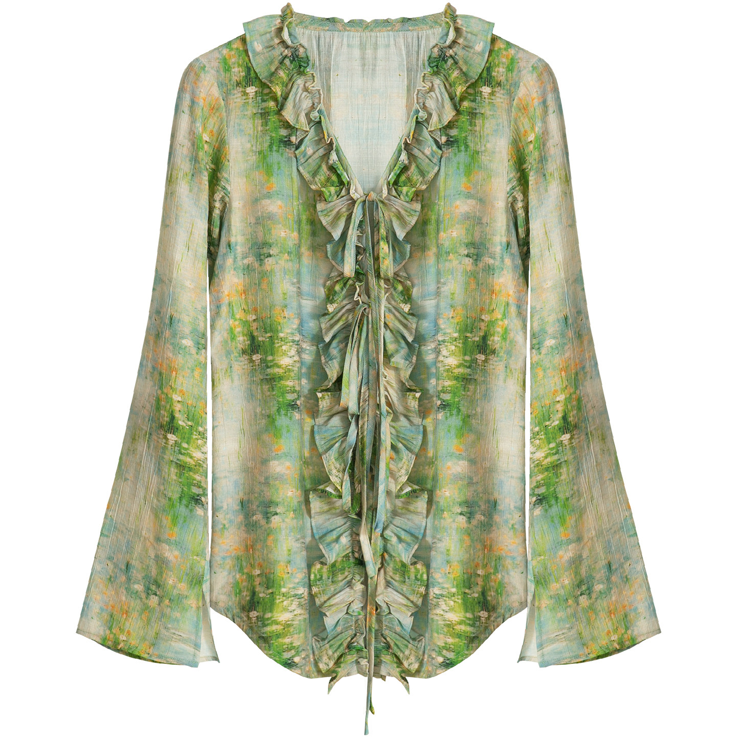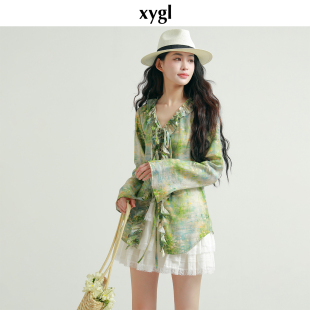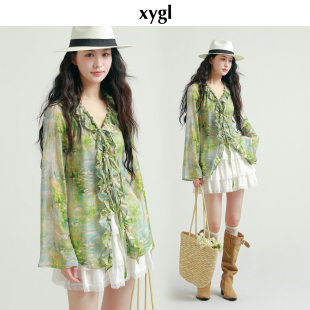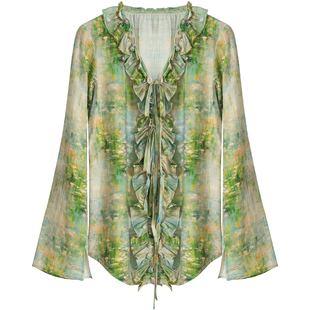 上衣 女春小众收腰喇叭袖 稀有概率 莫奈睡莲原创设计感花边v领衬衫