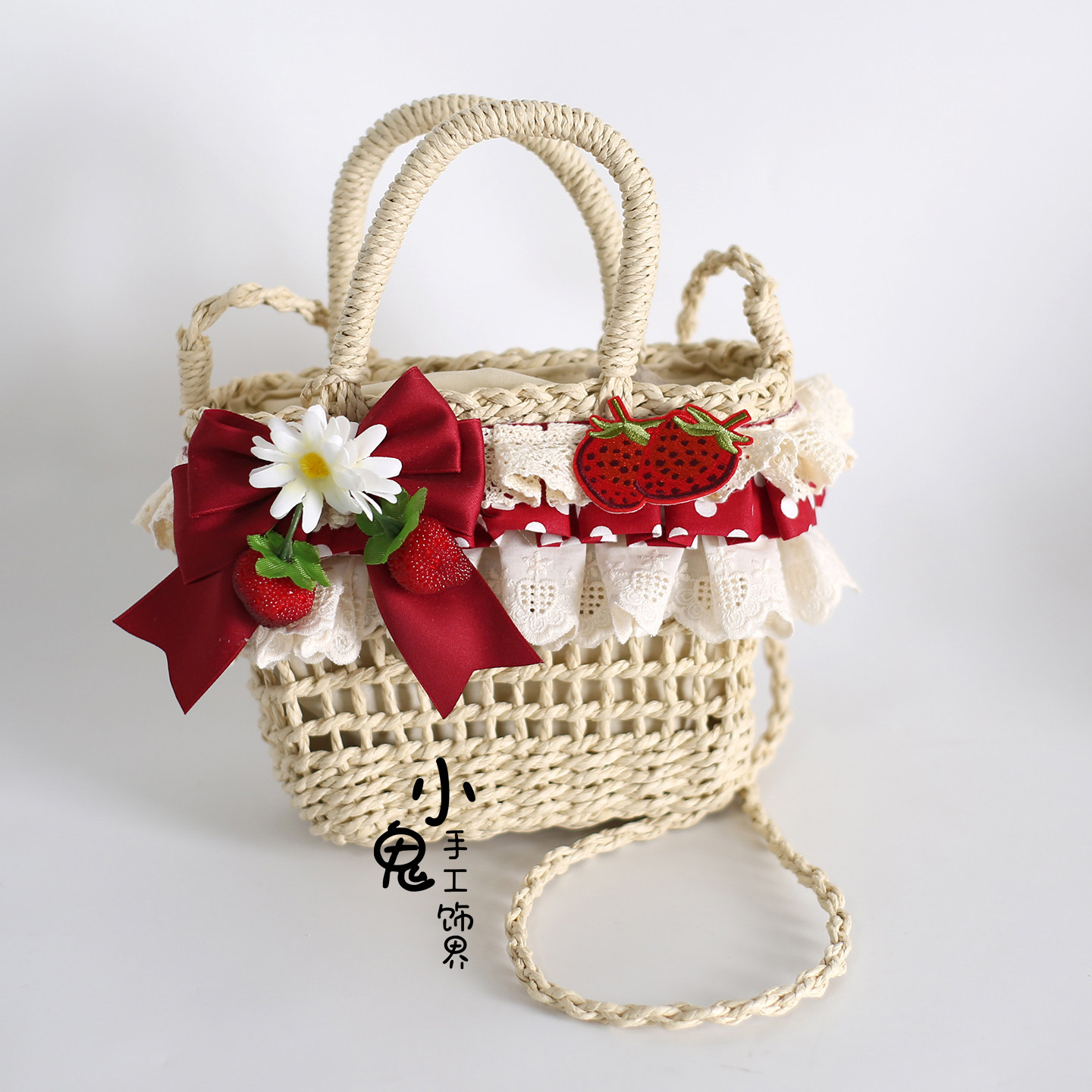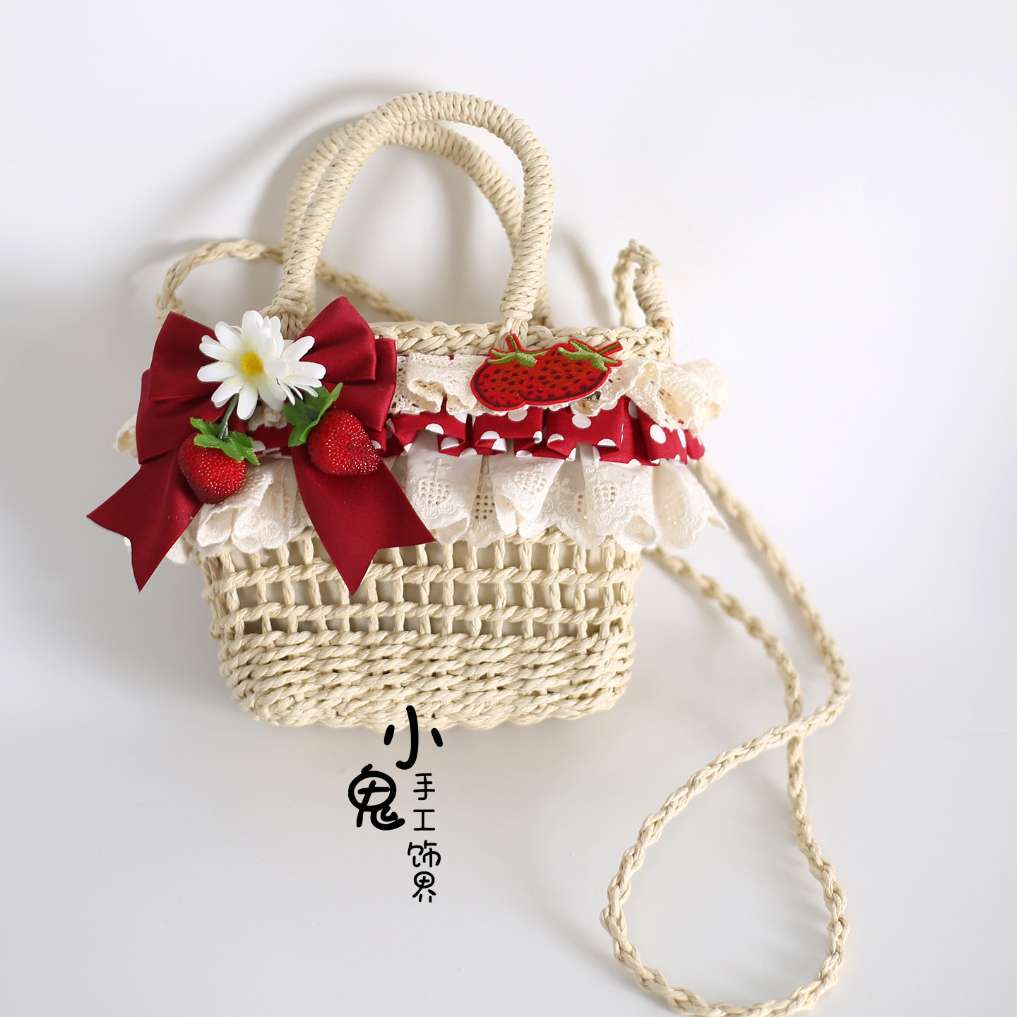 原创Lolita波点草莓塔塔蕾丝田园草编包藤编包手提编织包斜跨包