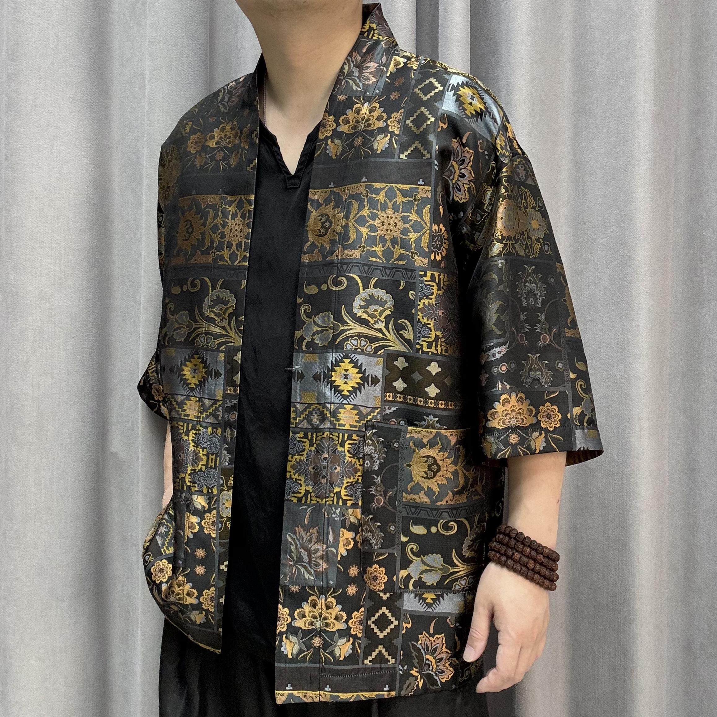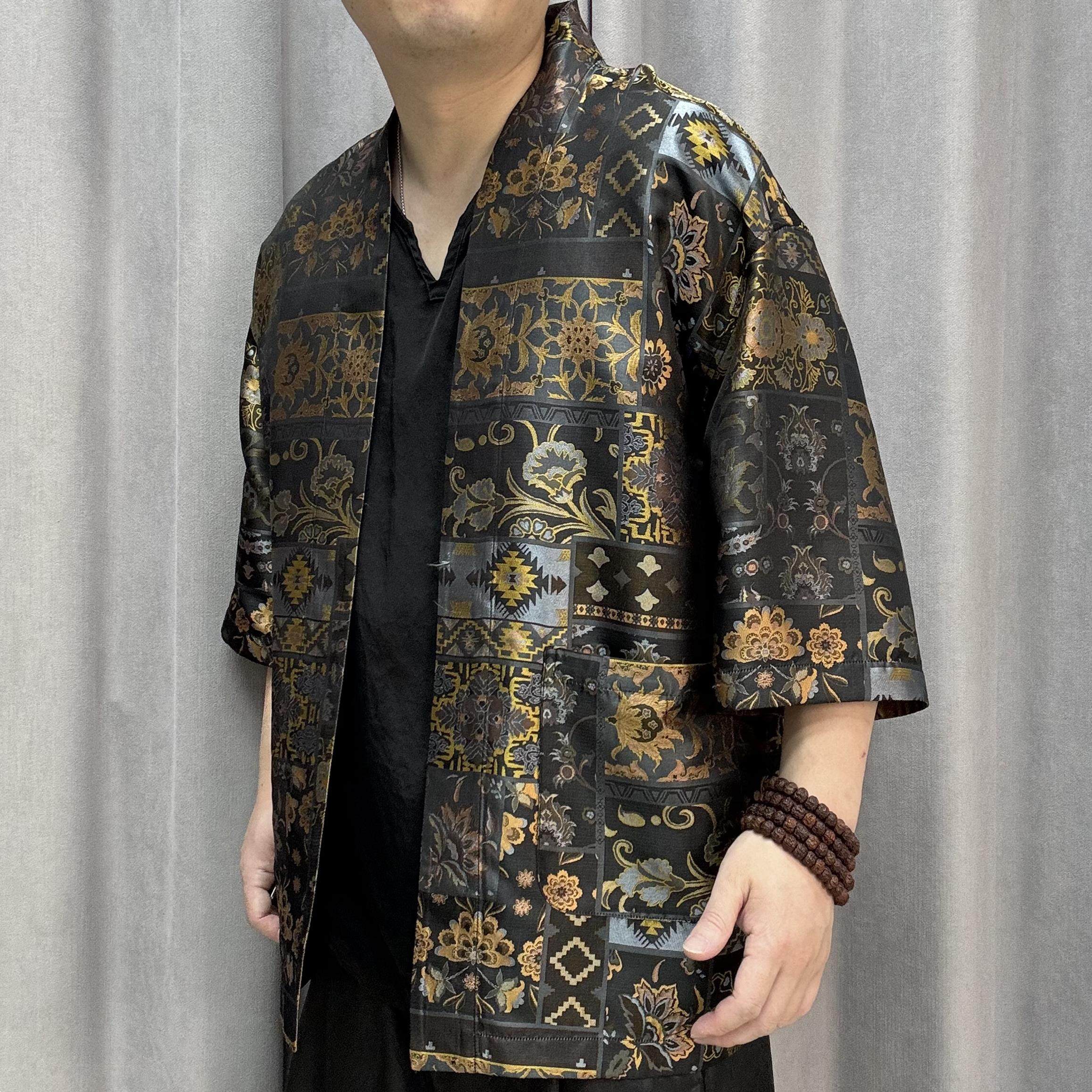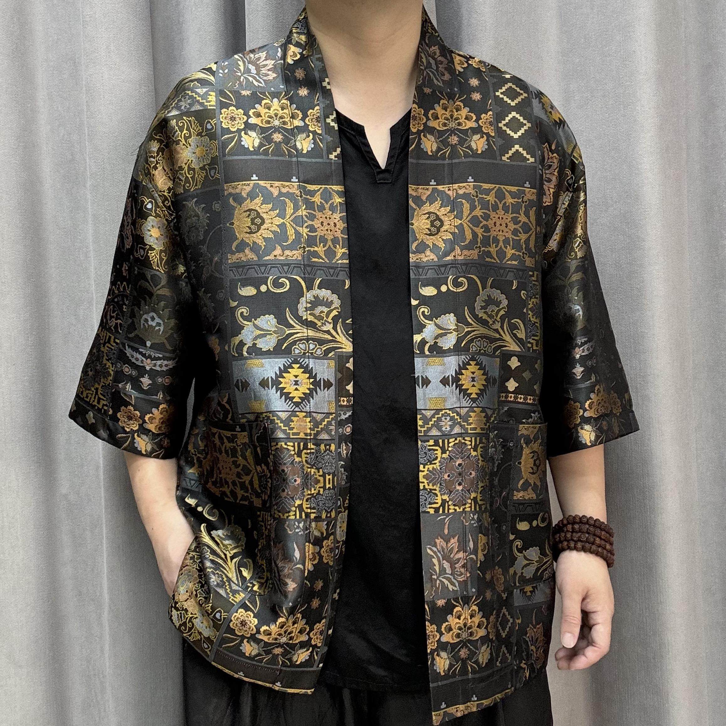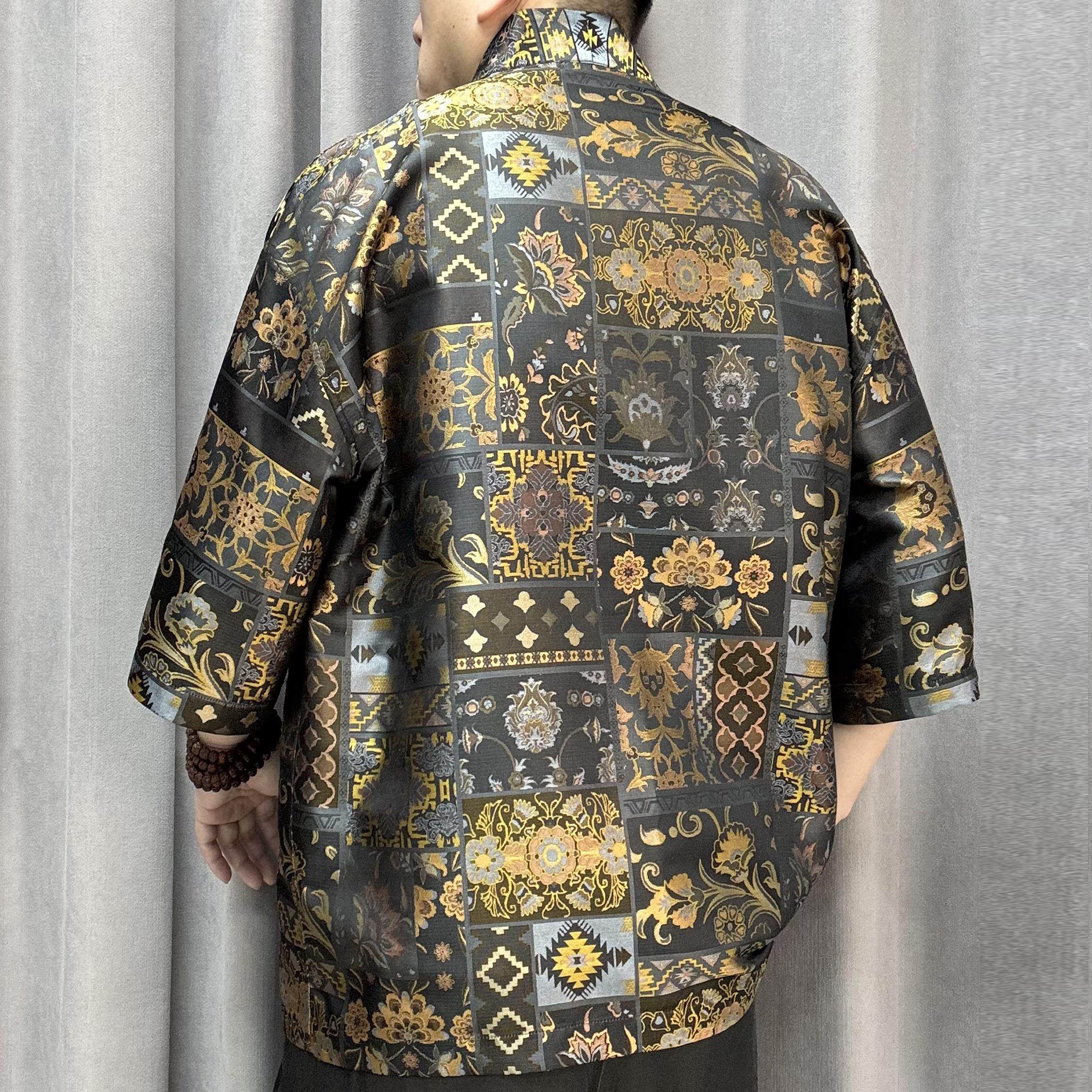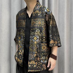 中国风夏季 提花衬衫 宽松2566 外套道袍领男七分袖 壮锦桑蚕丝男装