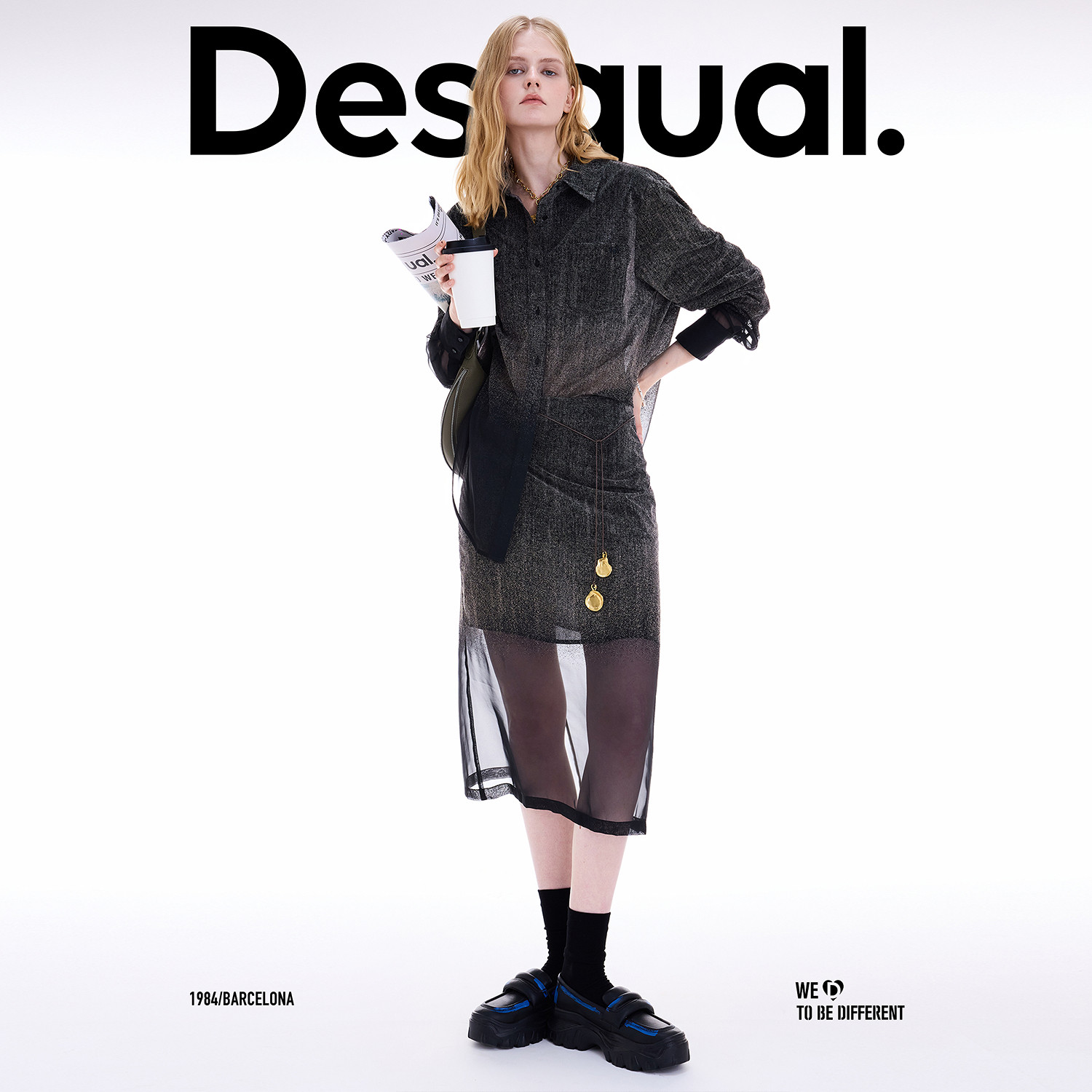Desigual26春夏新品 黑色植绒仿牛仔渐变欧根纱女士衬衫