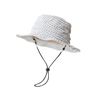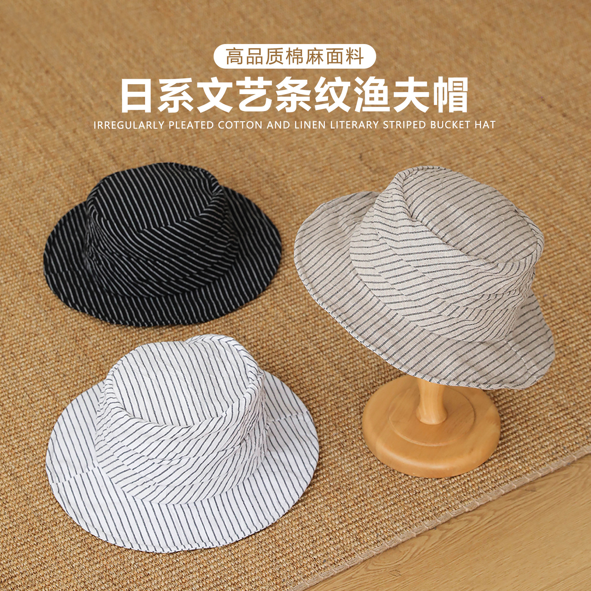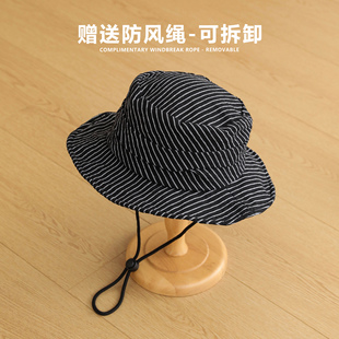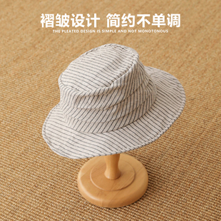 日系文艺条纹渔夫帽高品质棉麻褶皱平顶盆帽轻薄透气遮阳帽子男女