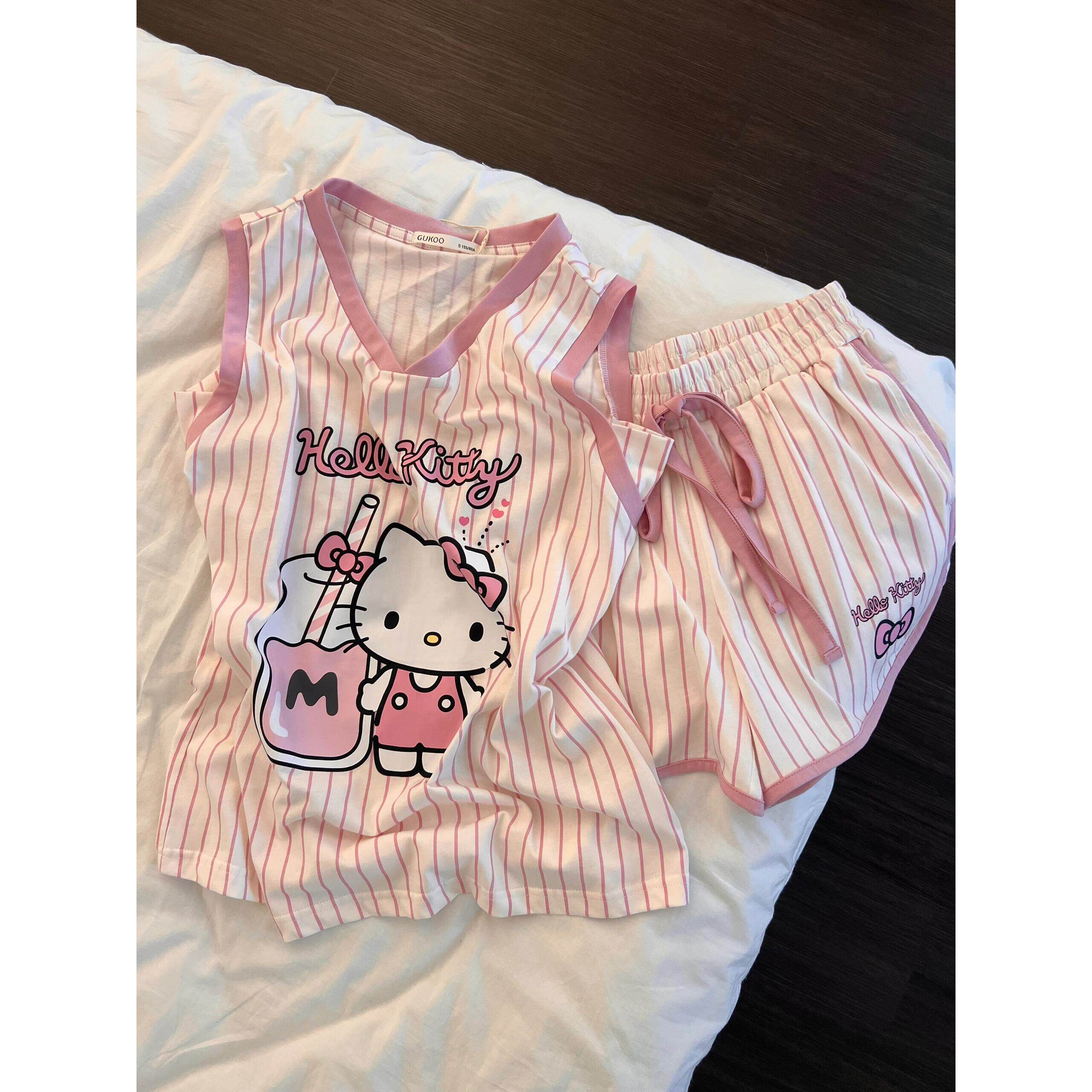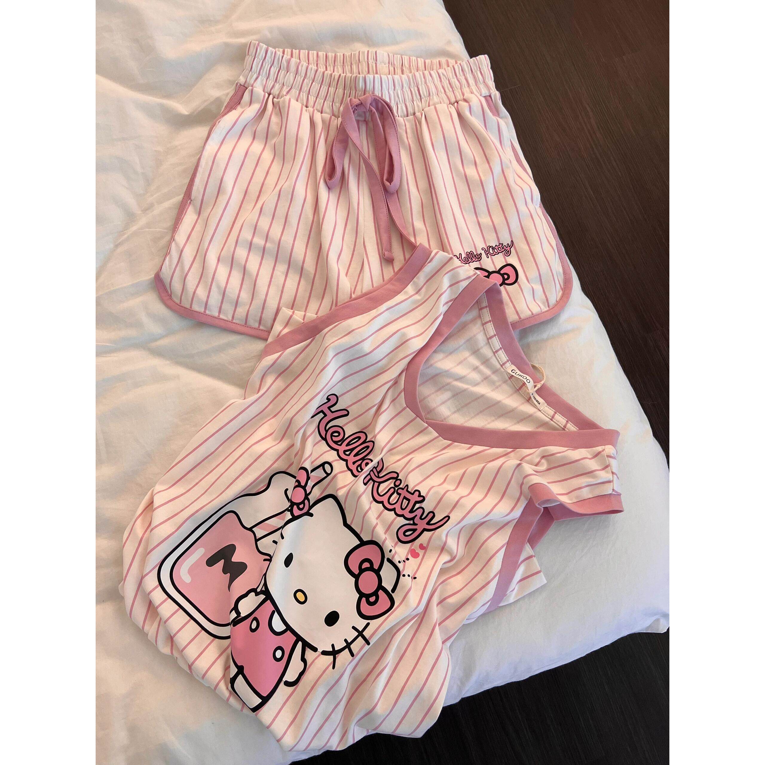 时尚 粉色可爱Hellokitty睡衣女夏季 短裤 休闲无袖 竖条纹家居服 新款