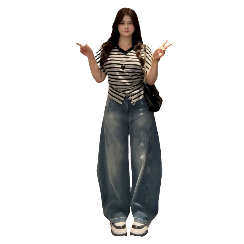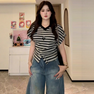 t恤女夏2026新款 复古条纹V领短袖 显瘦百搭绝美上衣 胖妹妹美式 大码
