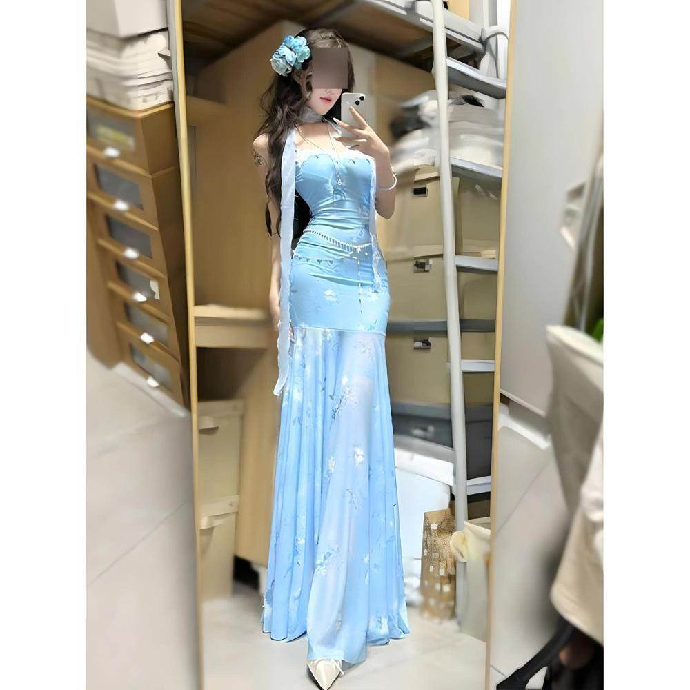 超仙气绝美网纱吊带连衣裙女夏新款 休闲海边度假包臀鱼尾掐腰长裙
