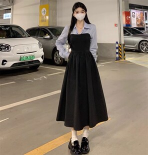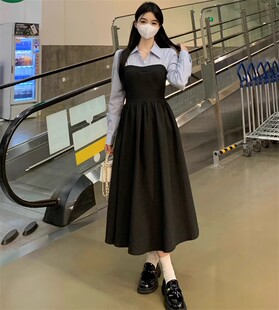 长袖 春秋新款 胖妹妹假两件赫本风法式 女装 收腰显瘦连衣裙女潮 大码
