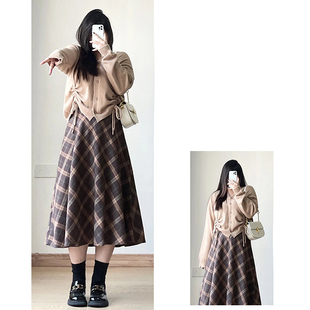 大码 格子半身裙女复古长裙胖mm显瘦a字伞裙毛呢裙子高腰半裙 女装