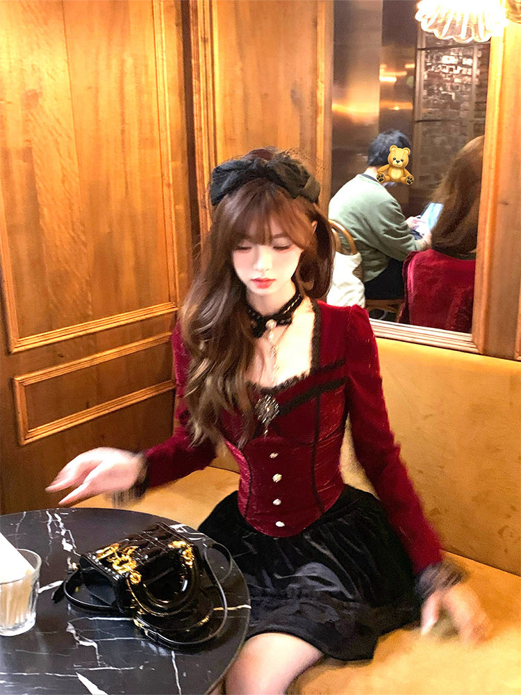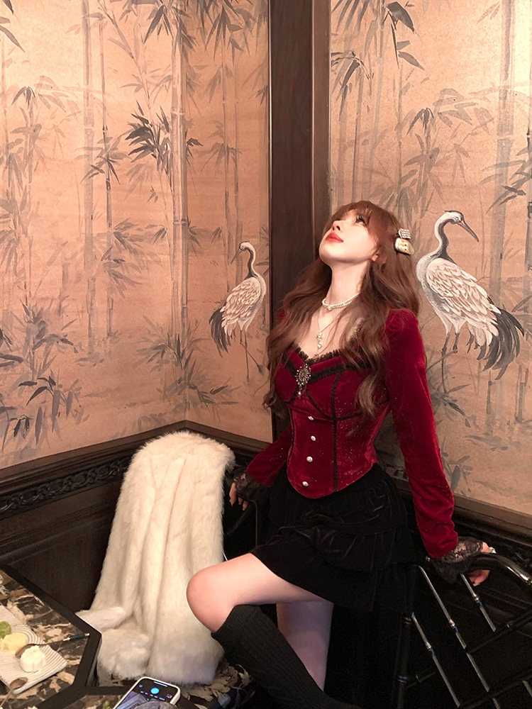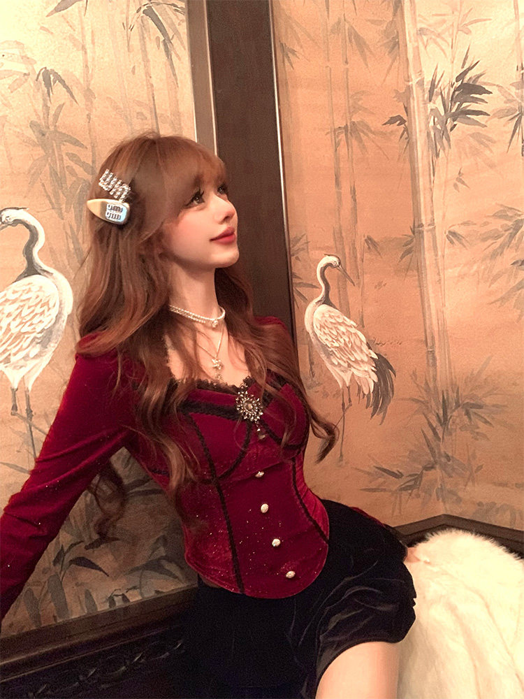Lazy 新年战衣过年穿搭红色丝绒细闪秋冬内搭上衣 Didi胭黛星光