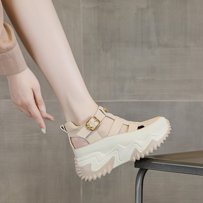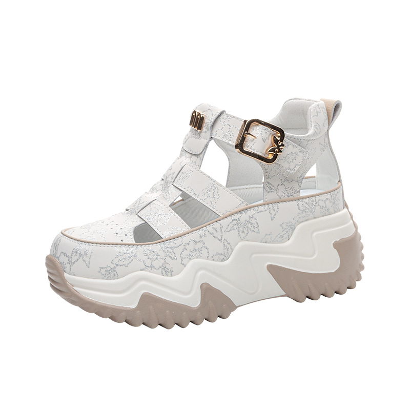 运动休闲厚底内增高小白鞋 夏透气洞洞罗马鞋 子女2025新款 真皮凉鞋