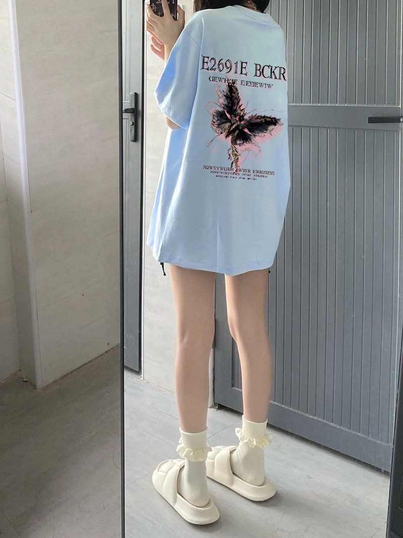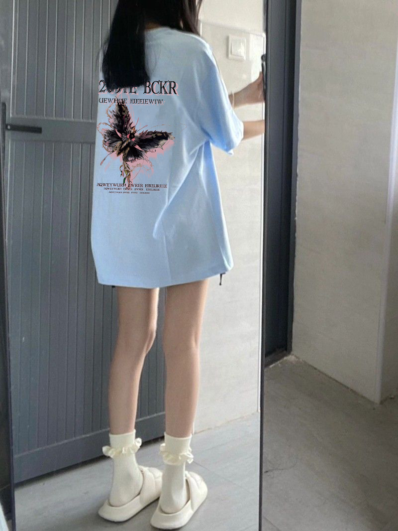 t恤女韩版 短袖 宽松设计感显瘦上衣 蝴蝶印花2024新款 100%纯棉美式