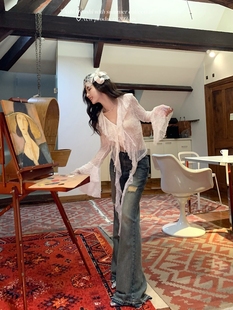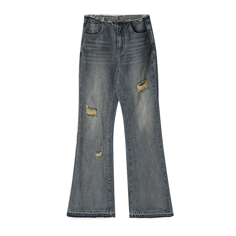 毛边高腰显瘦拖地阔腿裤 大于诗集街头chill 破洞设计微喇叭牛仔裤
