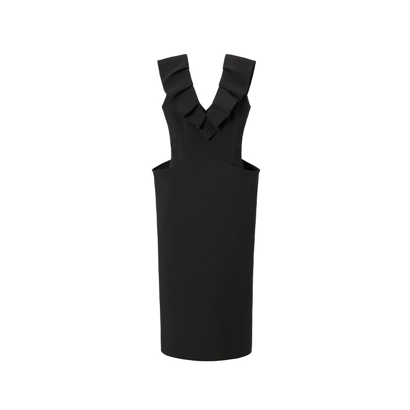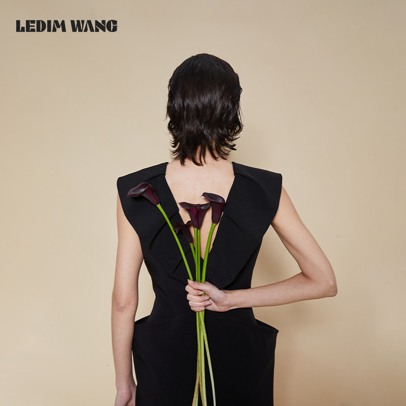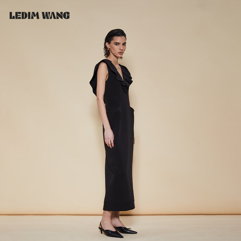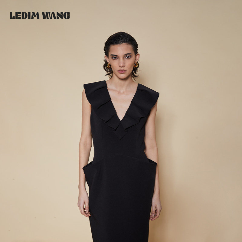 LEDIM 长裙 WANG结构鱼骨连衣裙女优雅气质黑色深V荷叶翻领新款