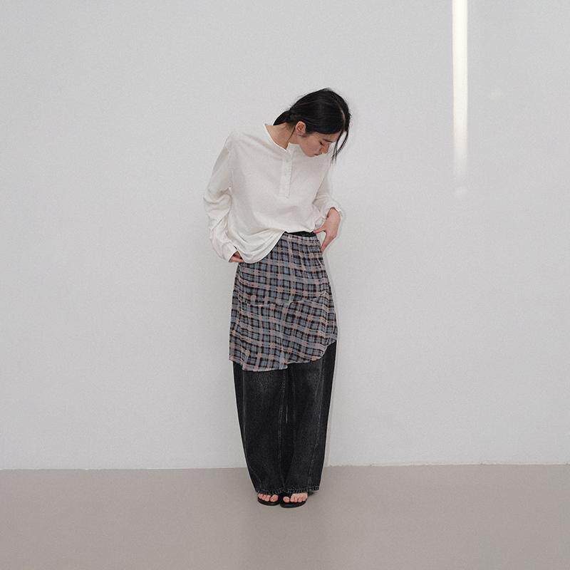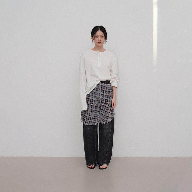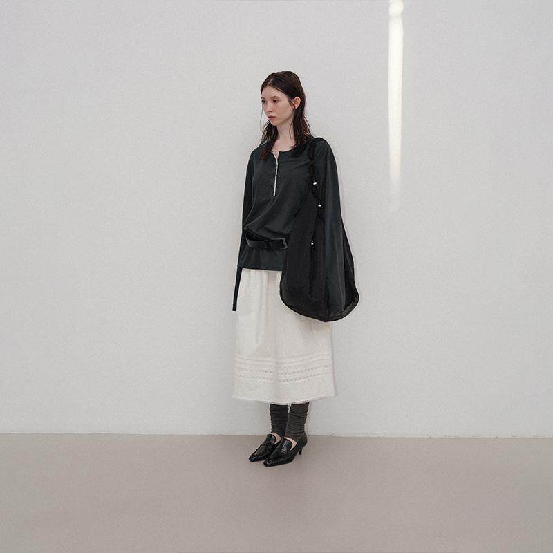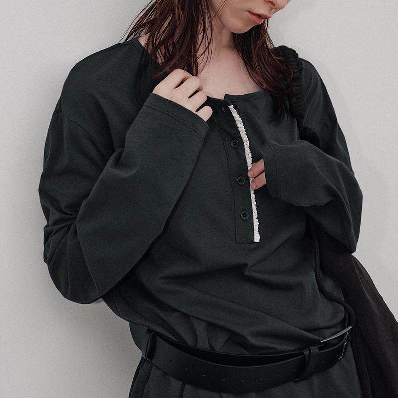 Veega 亚麻混纺亨利领随性慵懒风花边圆领T恤 Chic