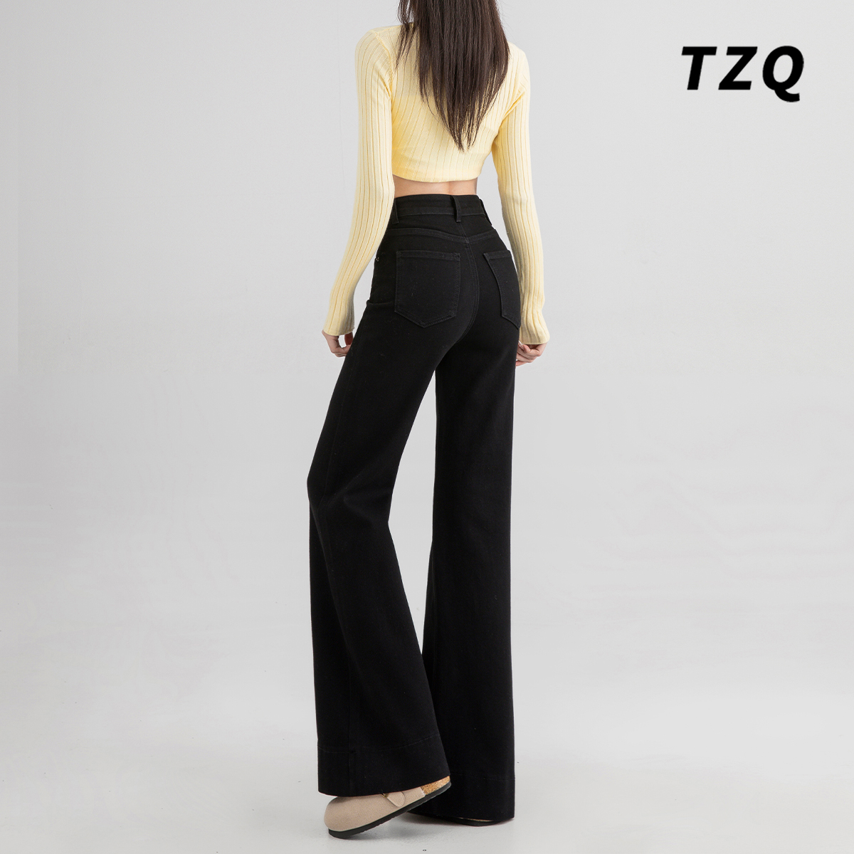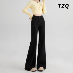 高街辣妹马蹄长裤 高腰紧身显瘦美式 女秋冬款 黑色复古微喇叭牛仔裤