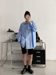 女秋季 衬衫 薄款 韩版 上衣 sun柚 衬衣宽松休闲慵懒风春秋季 蓝色长袖