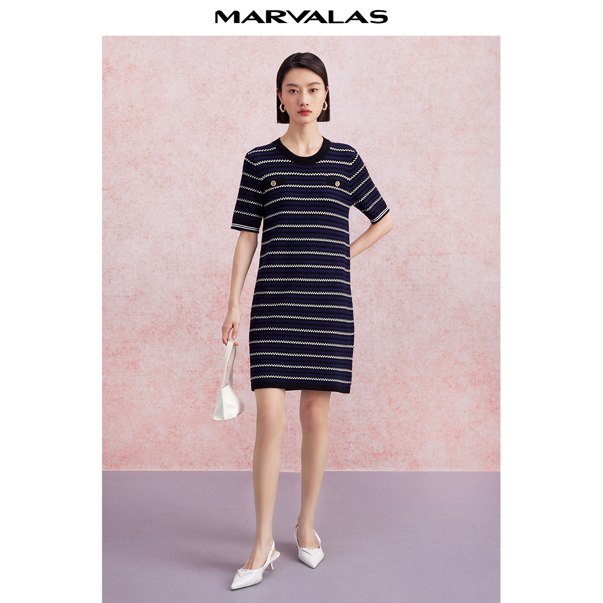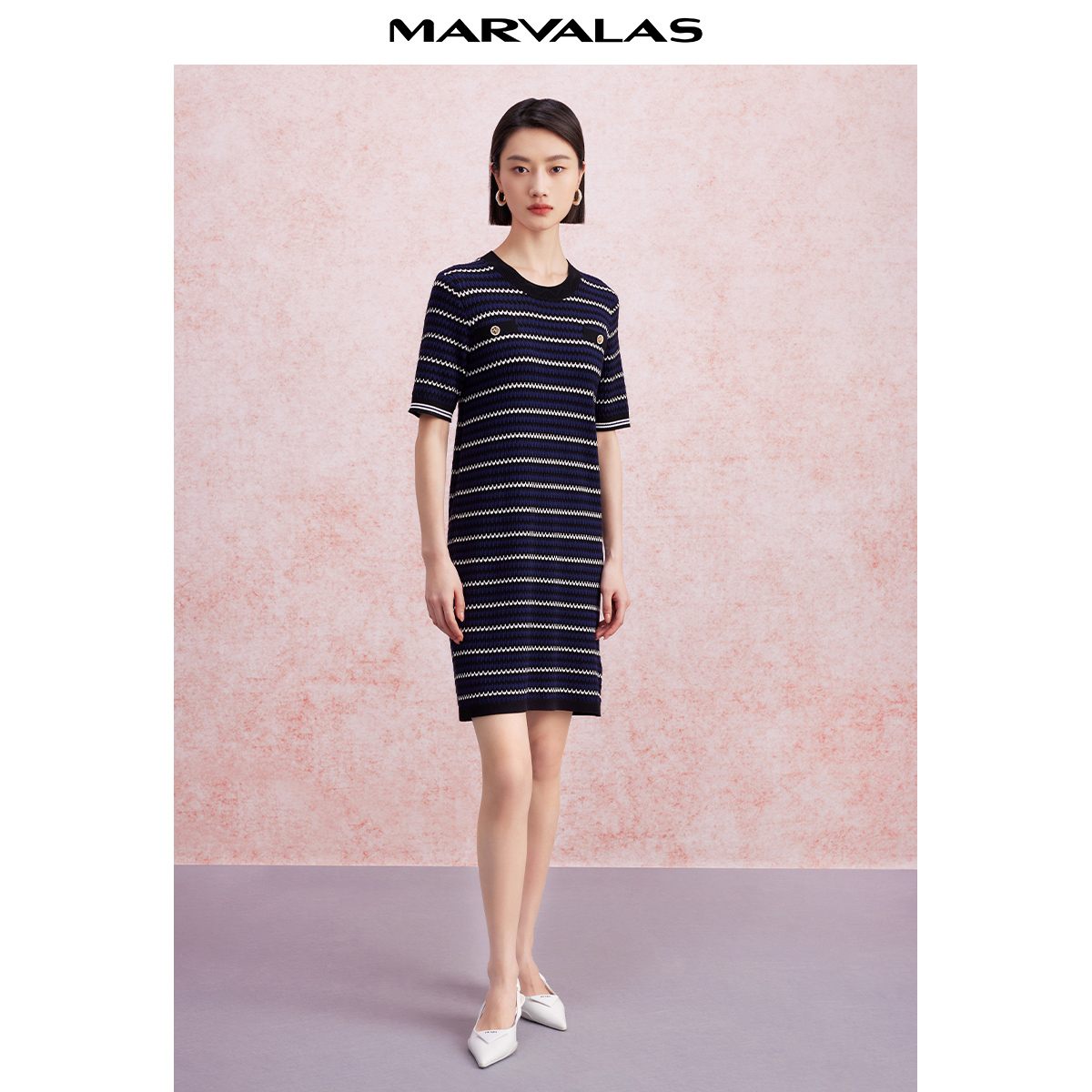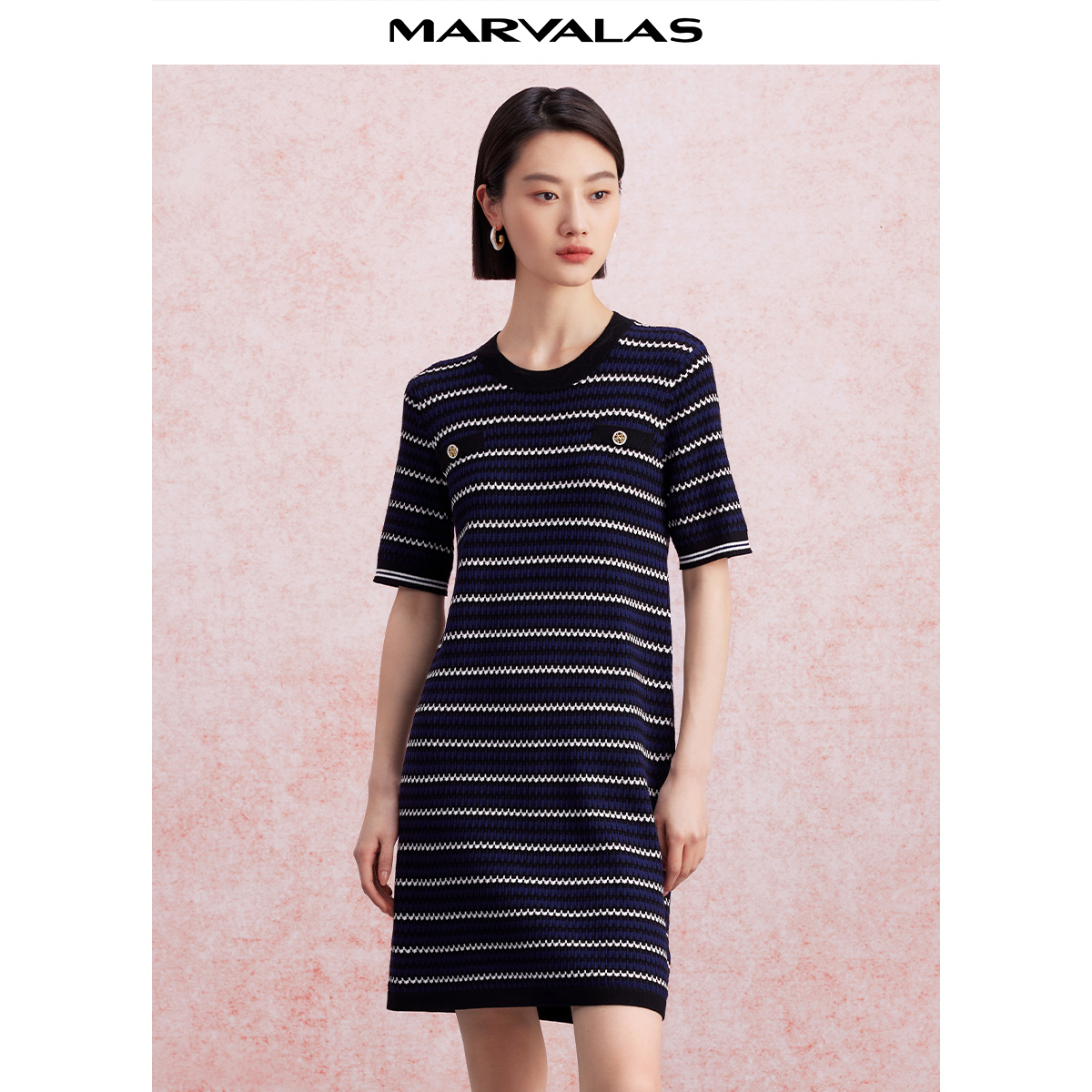 优雅风圆领复古一步裙 弹力法式 曼德诗条纹针织连衣裙2025秋季 新款