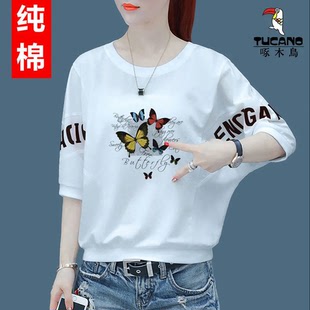 短袖 蝙蝠袖 t恤女洋气韩版 宽松大码 纯棉上衣 啄木鸟夏季 七分袖 新款