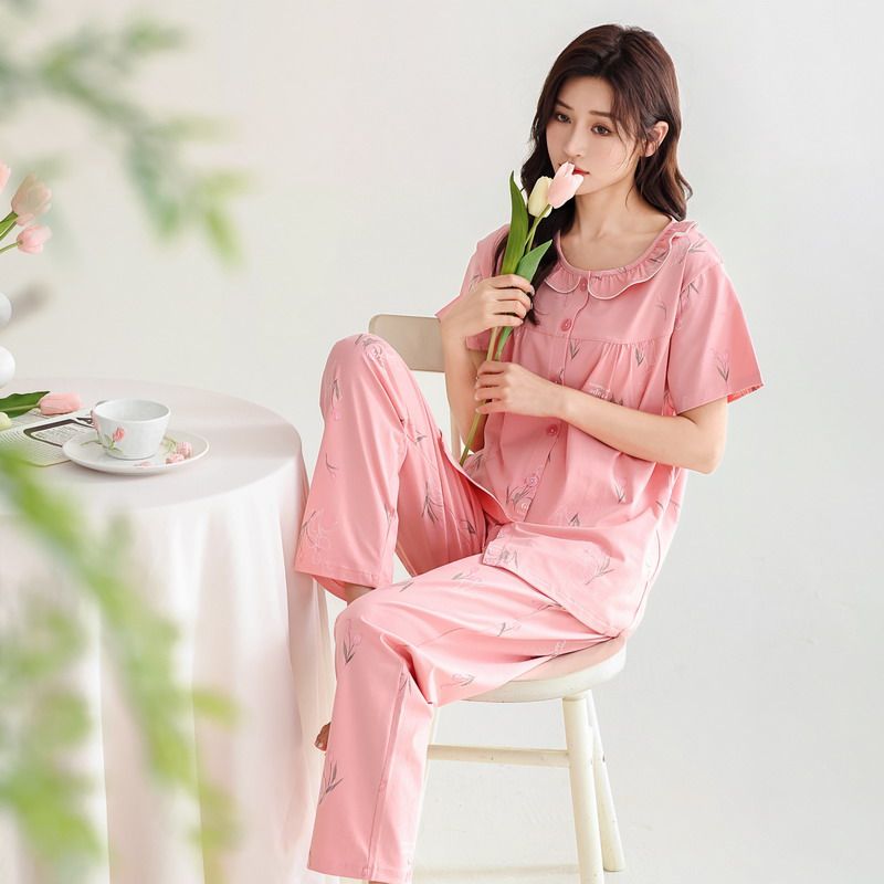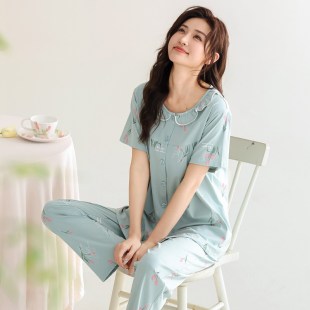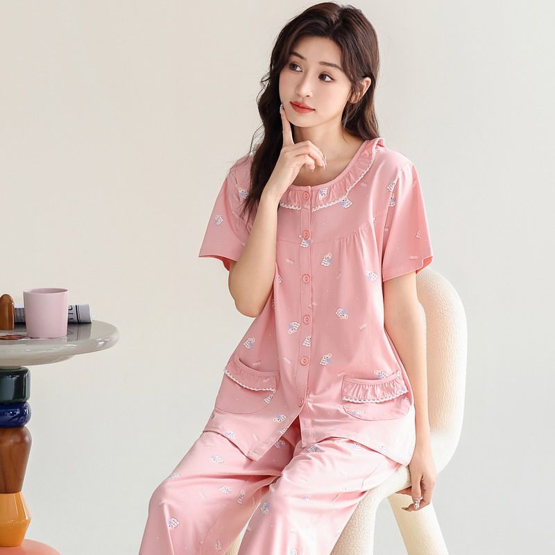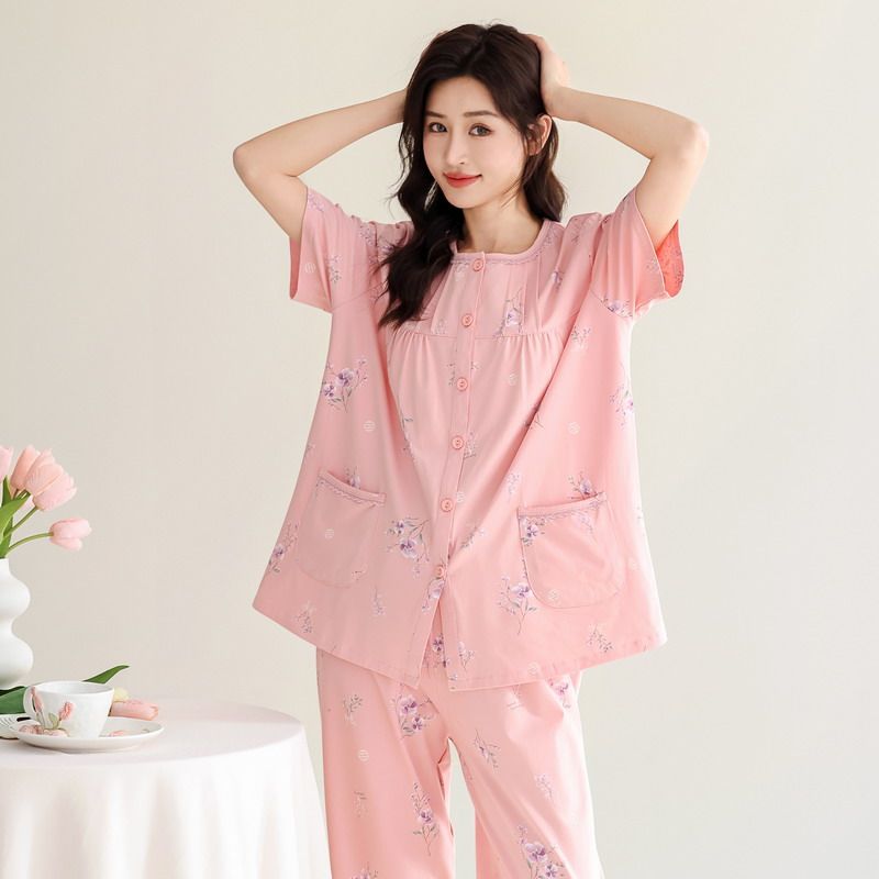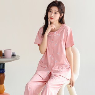短袖 家居服套装 长裤 圆领开衫 女士加大码 绮宇娜睡衣拉架纯棉夏季