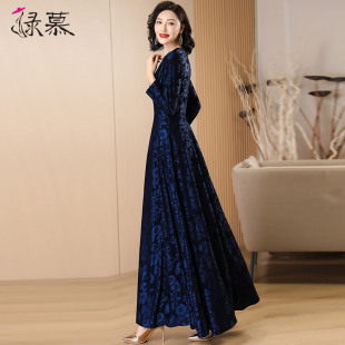 高级感藏蓝色精致提花连衣裙显瘦女2026春春秋新款 大摆长裙到脚踝