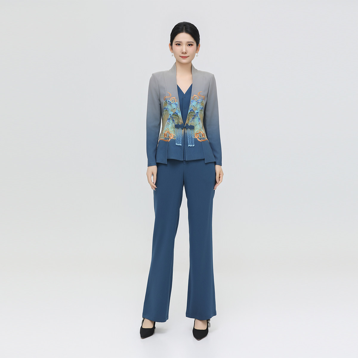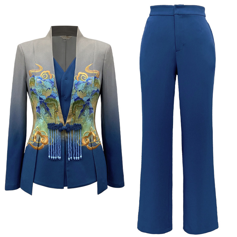 女春季 国风两件套装 刺绣渐变色气质职业西服新中式 浒城古娘新款