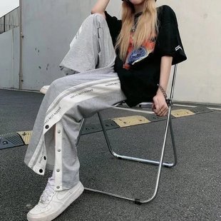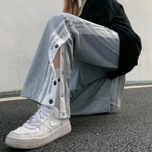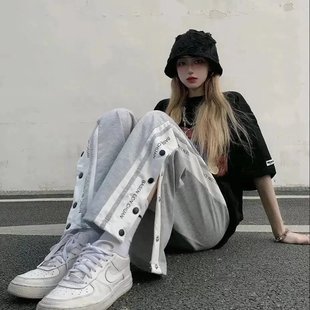 子 宽松显瘦休闲直筒长裤 高街侧排扣裤 女夏外穿ins潮流高腰运动裤