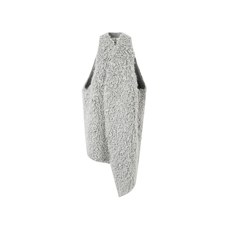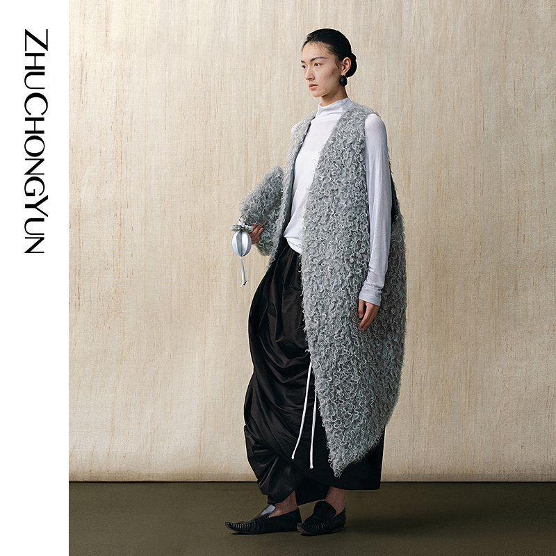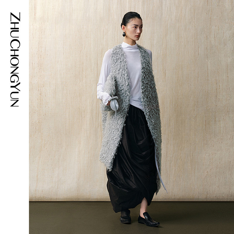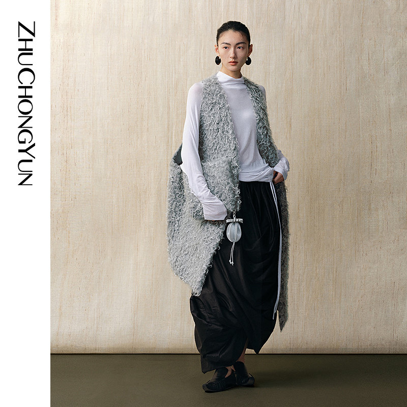 ZHUCHONGYUN2025春新款 背心马甲 卷曲肌理羊毛宽松不规则长款