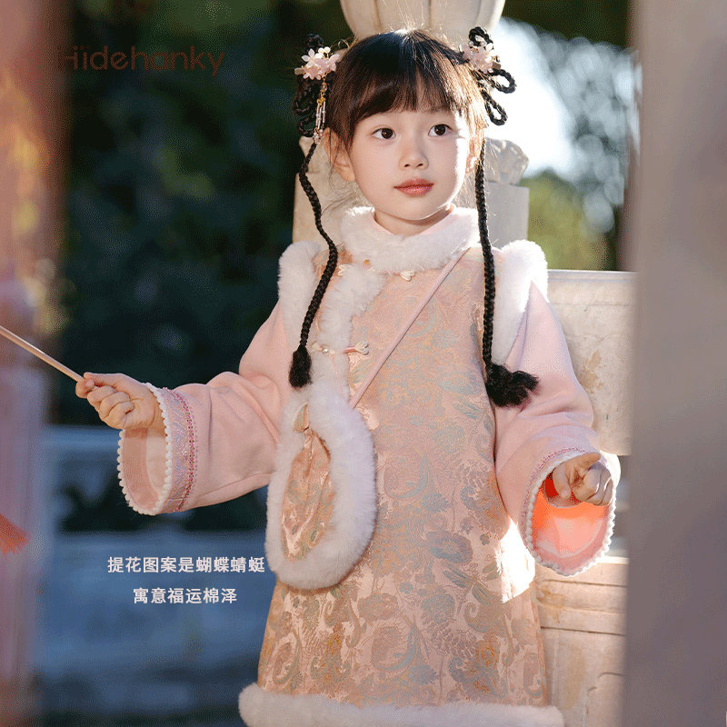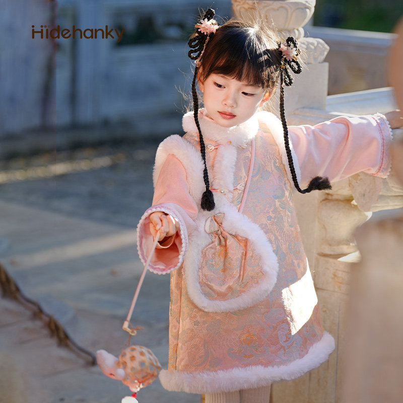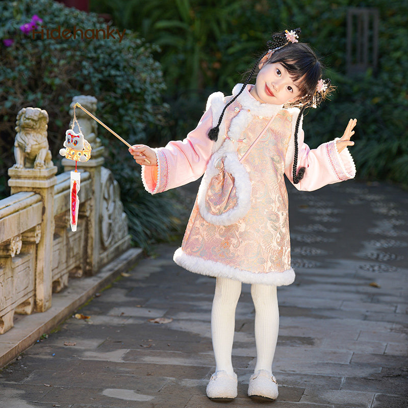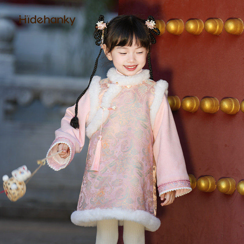 加绒 儿童过年战袍冬装 丢手绢童装 拜年服女童粉色旗袍连衣裙新中式