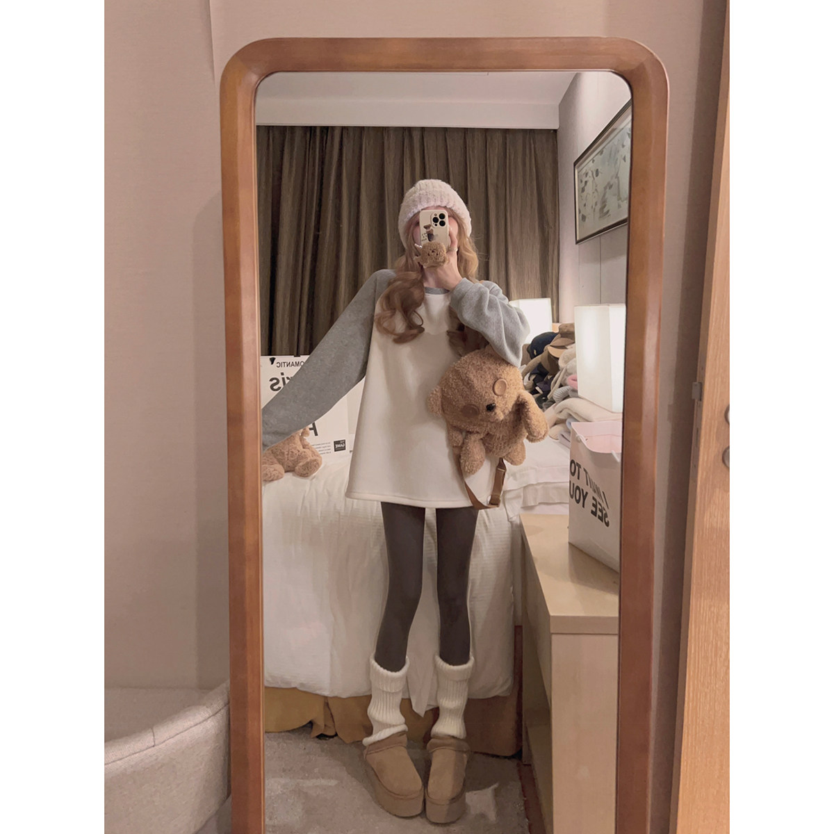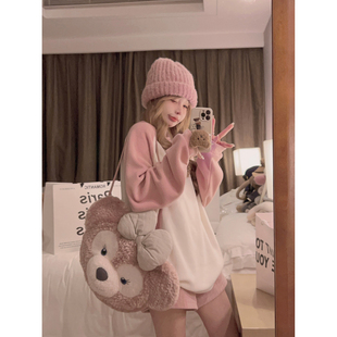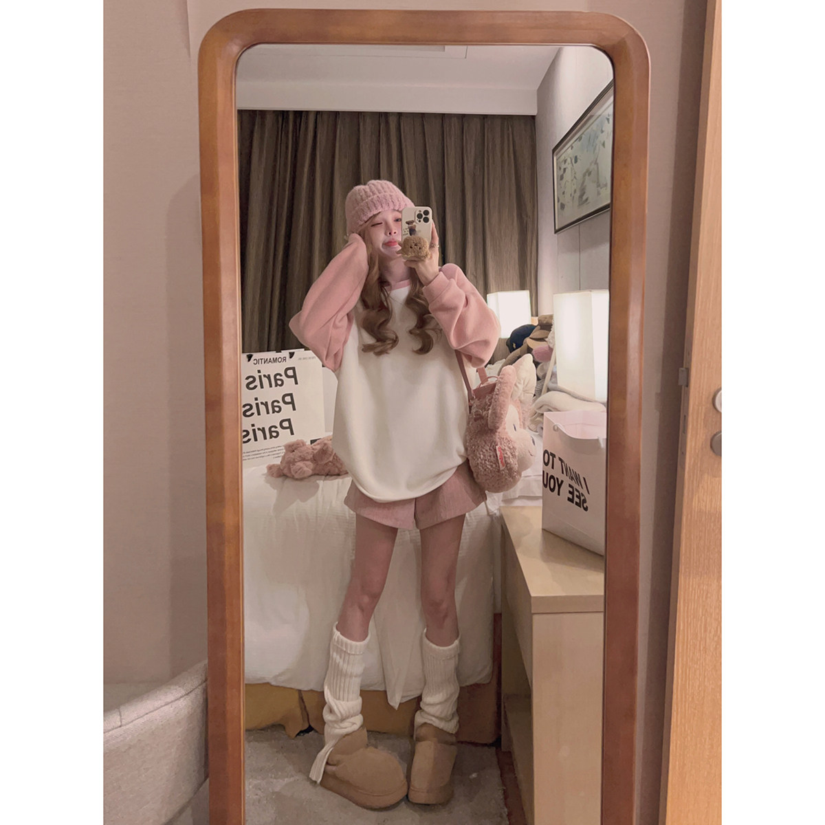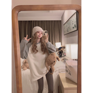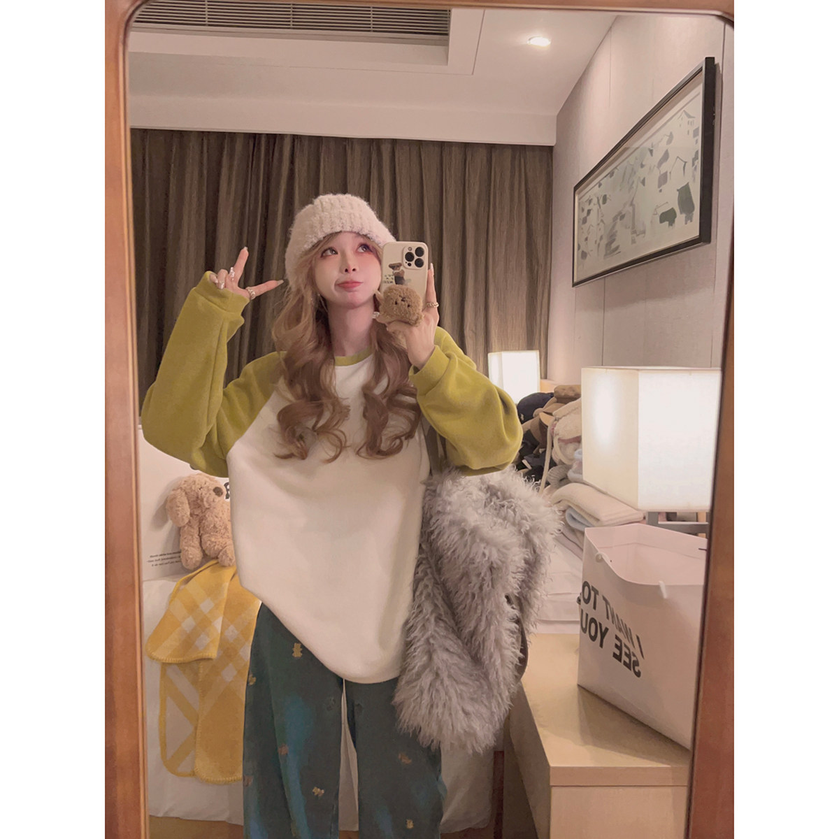 撞色加绒套头卫衣女冬韩系宽松圆领百搭时髦打底衫 Yukiss 插肩袖