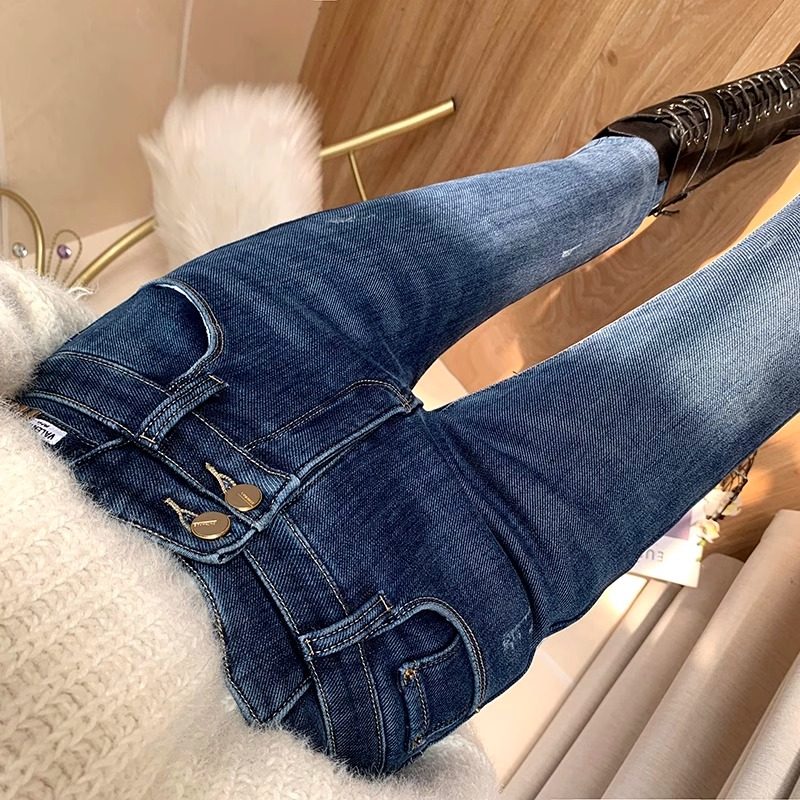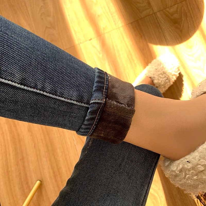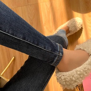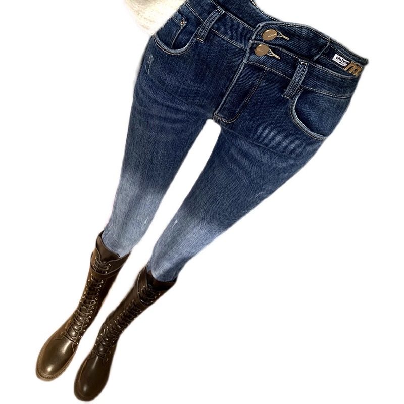 弹力紧身小脚靴裤 2025加绒加厚高腰显瘦铅笔裤 女秋季 深蓝色牛仔裤
