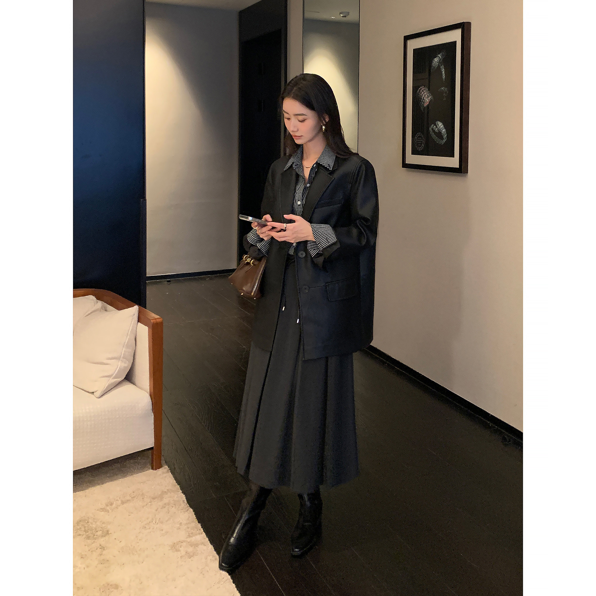 美拉德穿搭高腰棕色a字半身裙女大码 胖mm遮肚藏肉百褶显瘦长裙冬