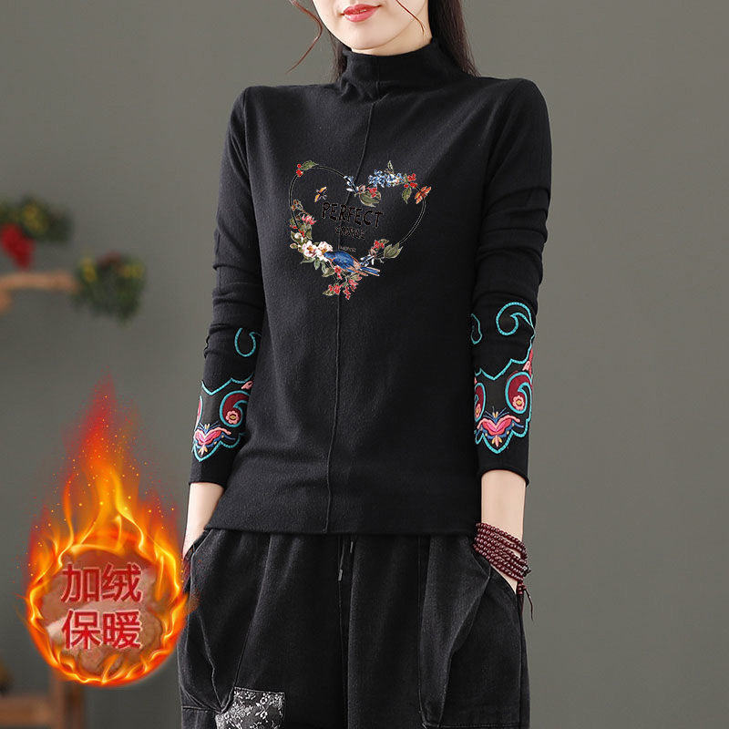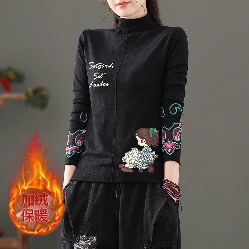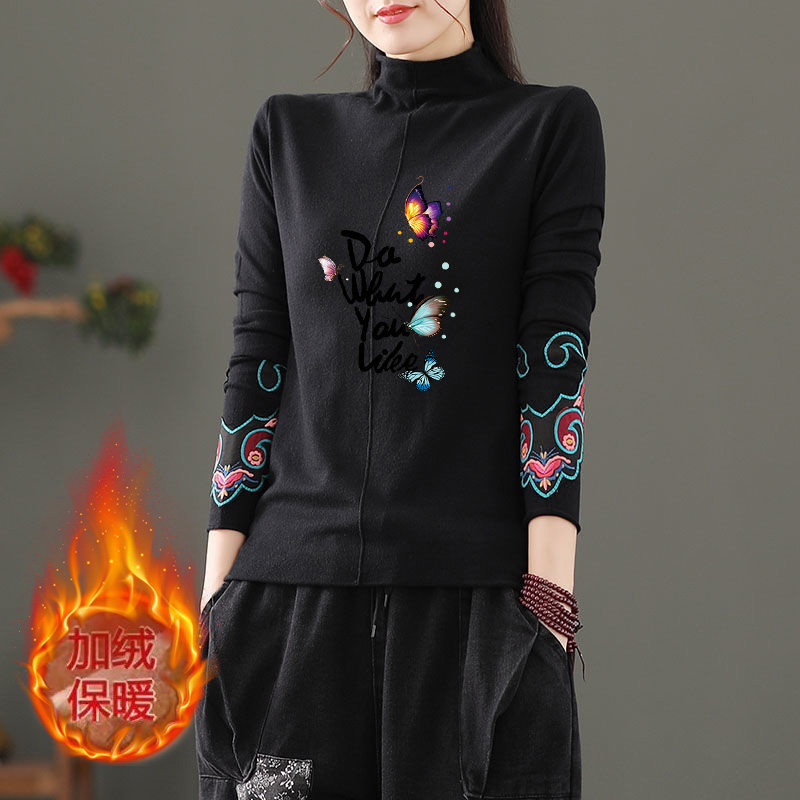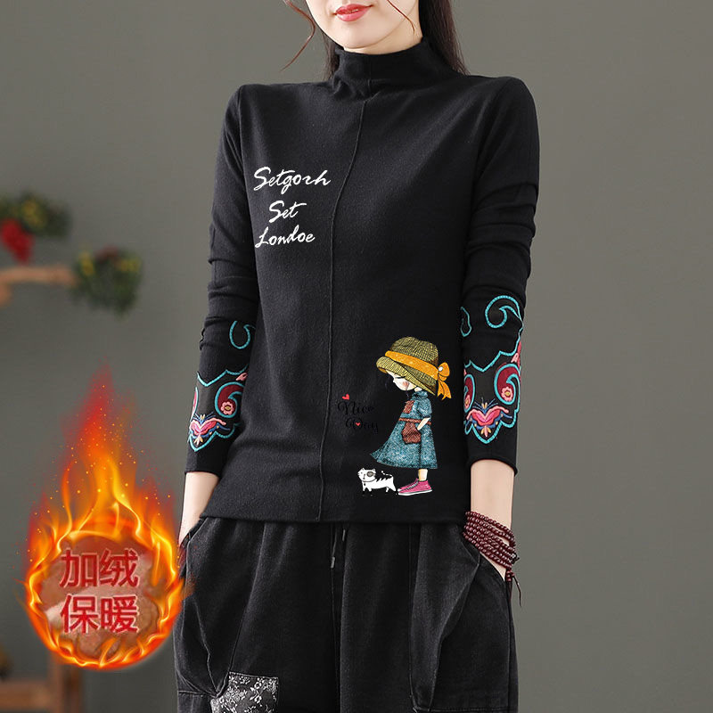 双面磨毛德绒文艺复古宽松半高领T恤女秋冬款 保暖印花上衣打底衫