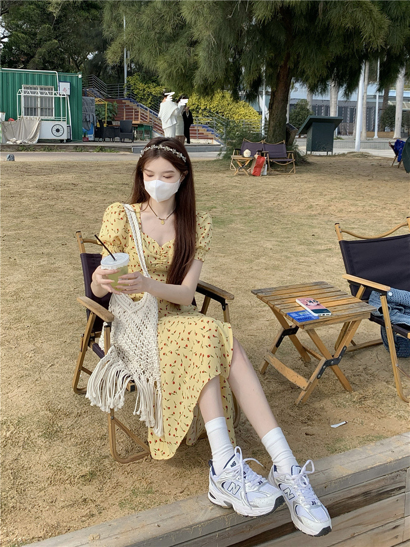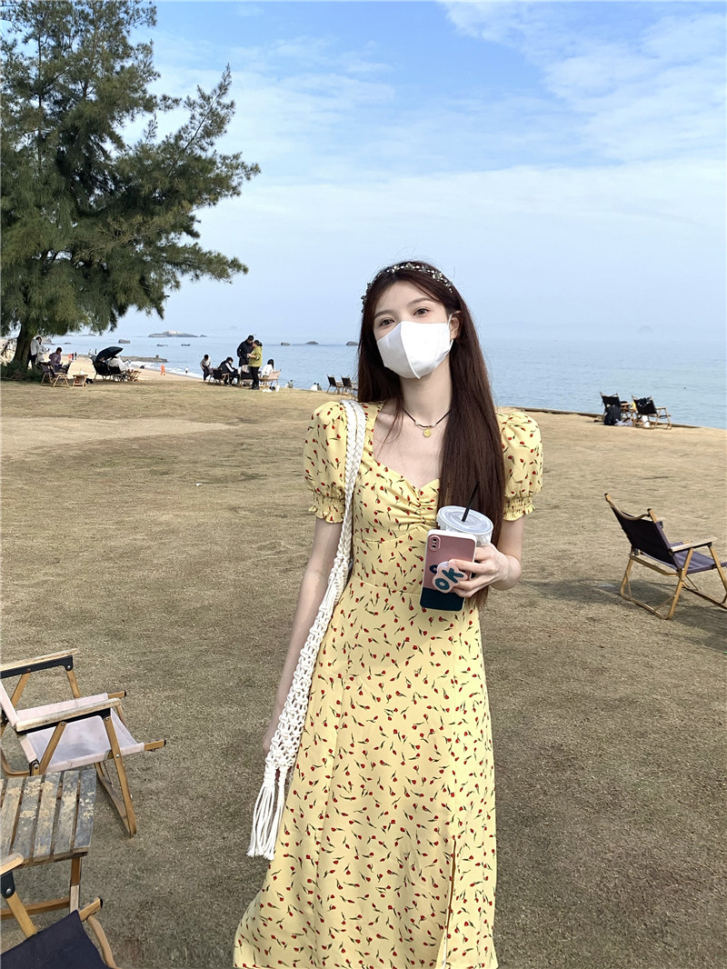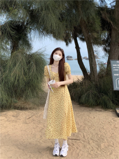 开叉中长裙xs码 145小个子法式 碎花连衣裙女夏150cm显高穿搭泡泡袖