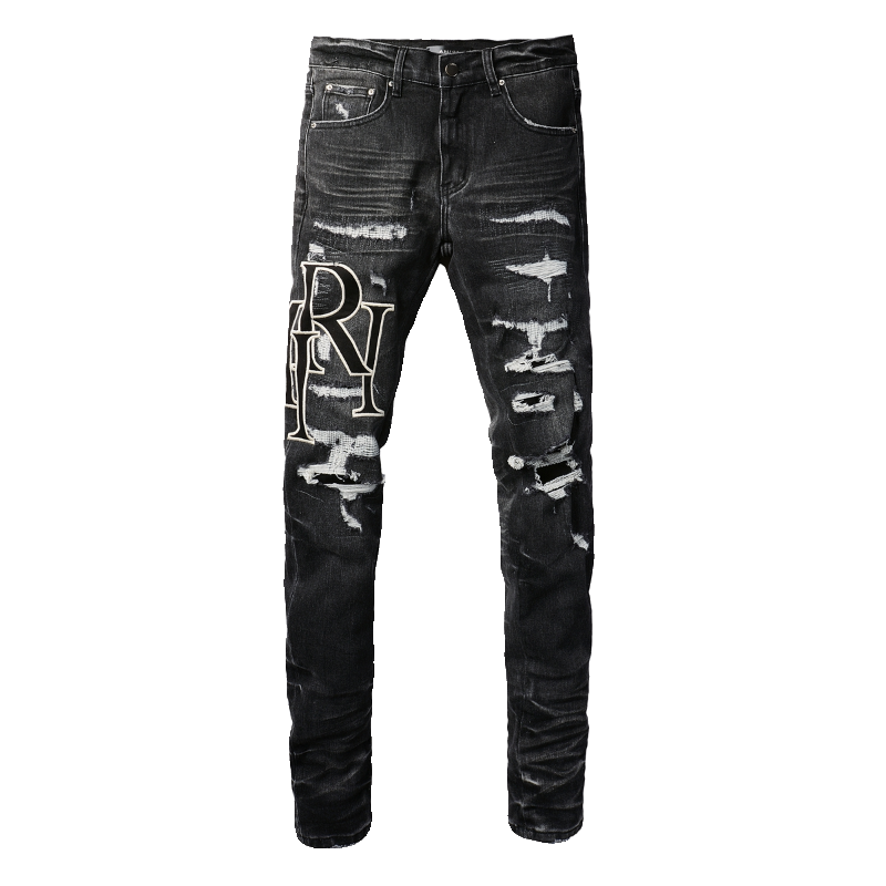 新款 小脚裤 男士 弹力修身 LOGO拼皮贴布破洞牛仔裤 高街潮牌AMR夏季