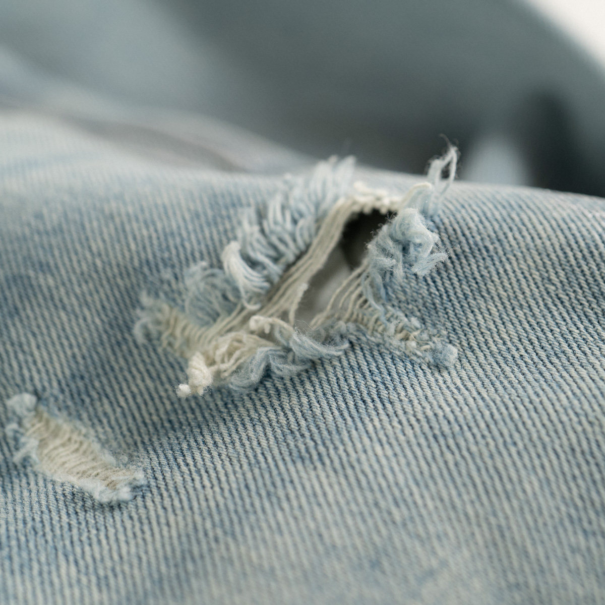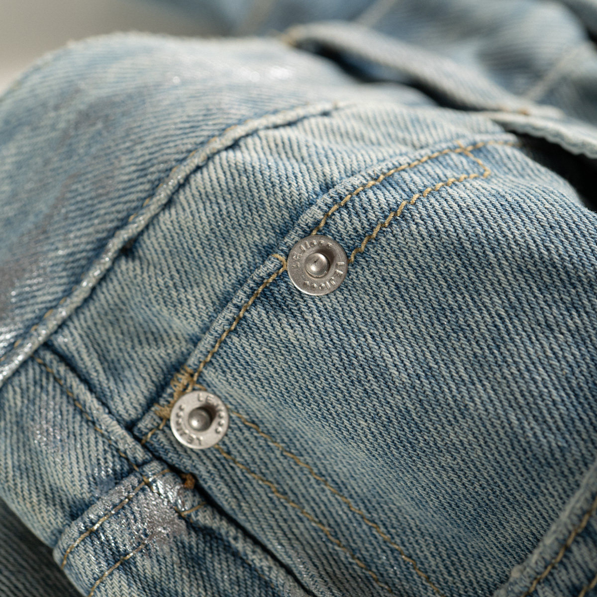 W24BT202 手工光泽银涂层高腰直筒磨破牛仔裤 烫银手工冰蓝牛
