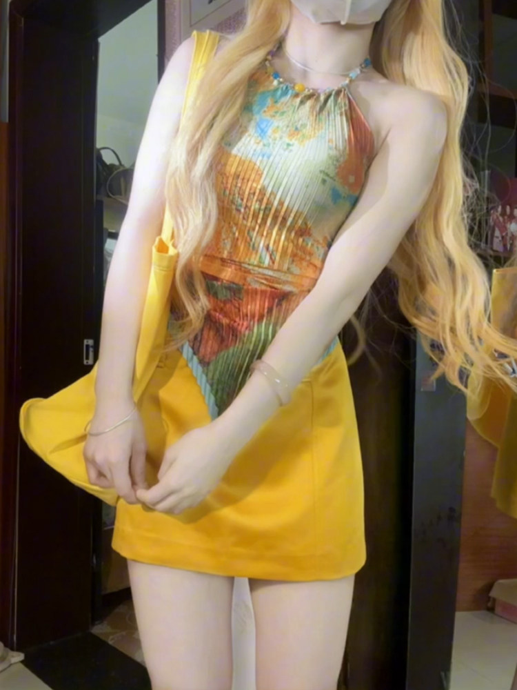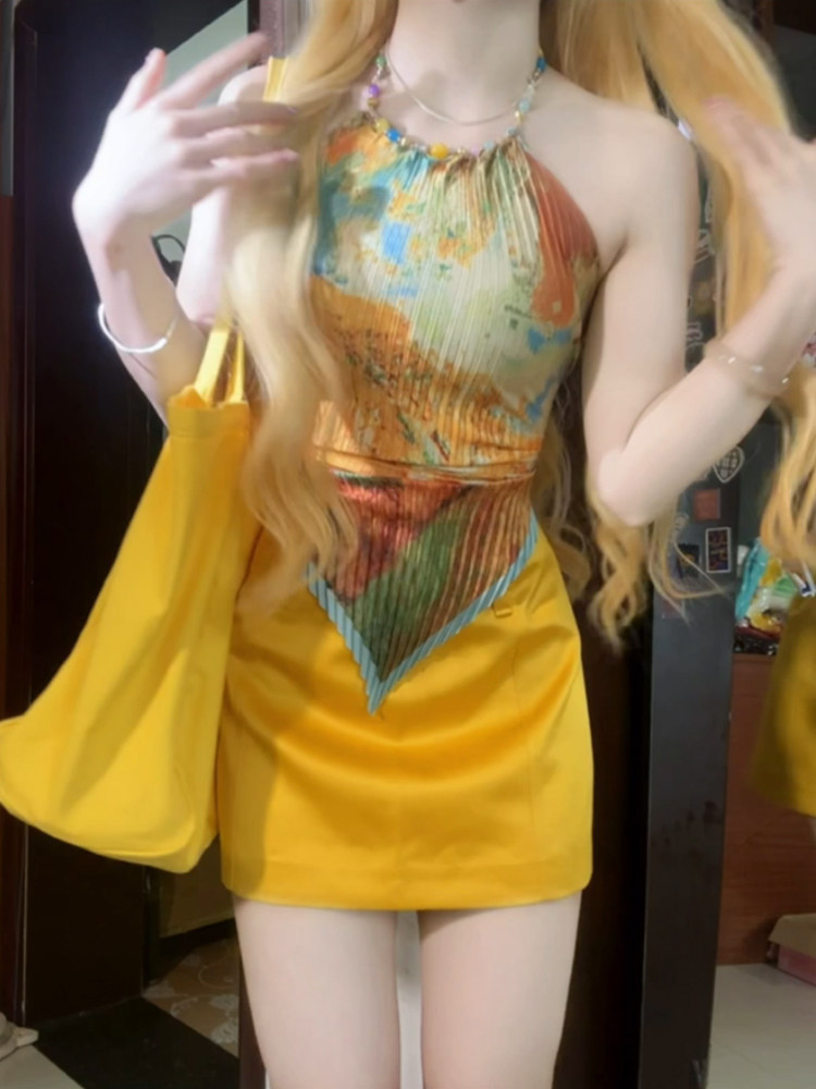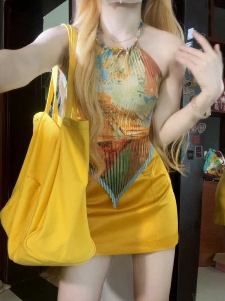 露背上衣 内搭外穿设计感短款 甜辣妹油画挂脖吊带小背心女夏季 修身