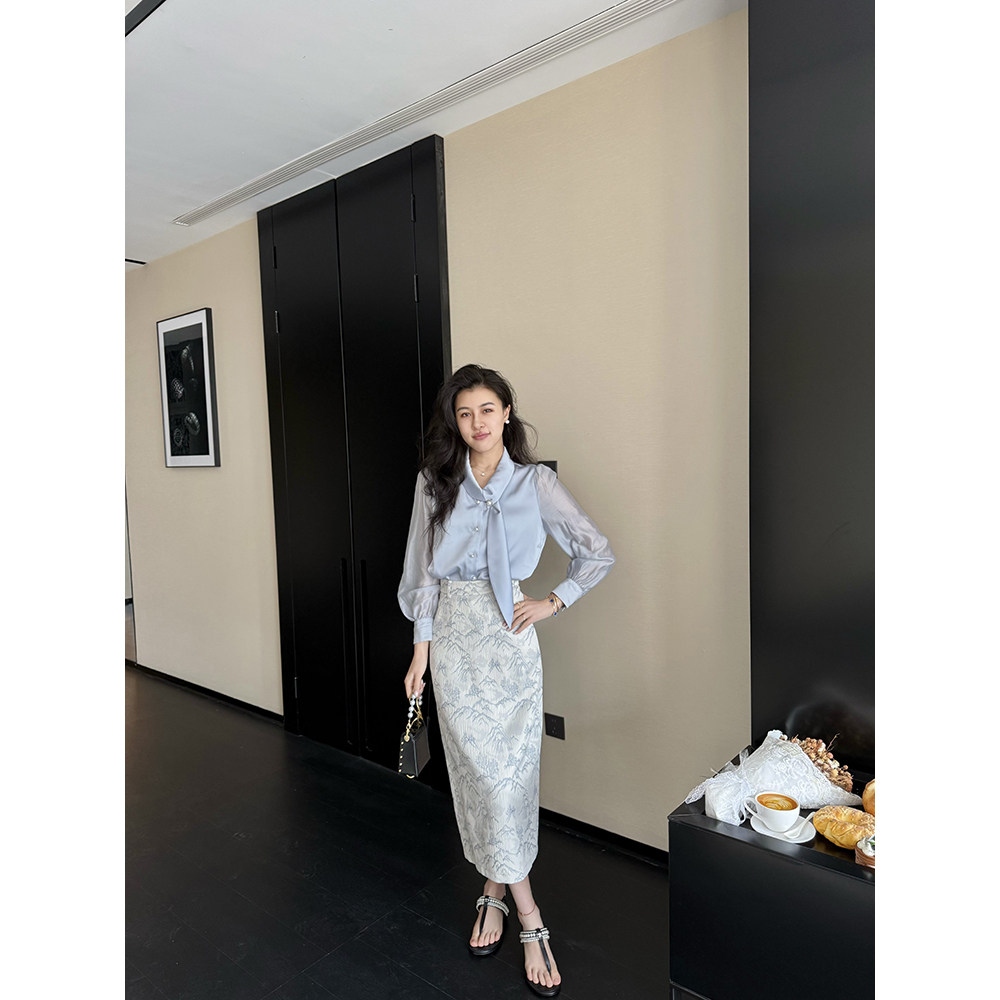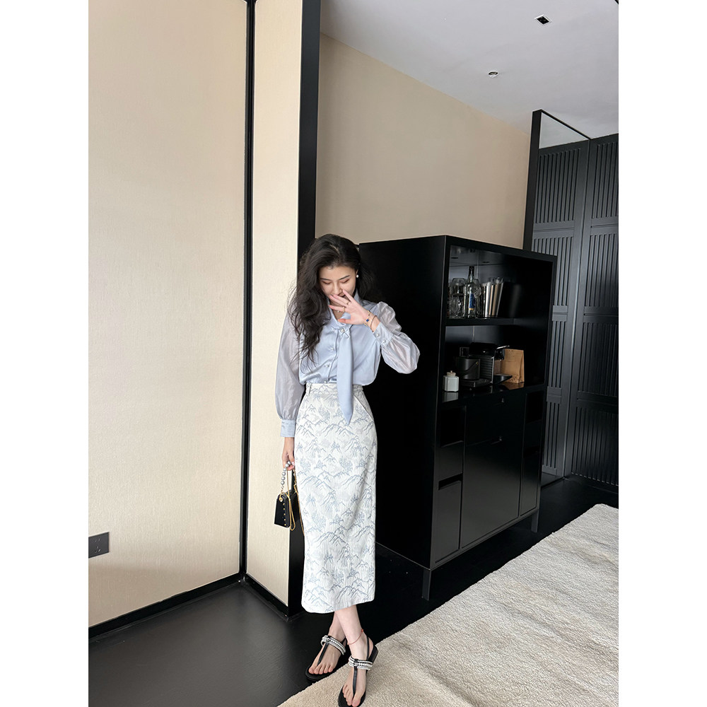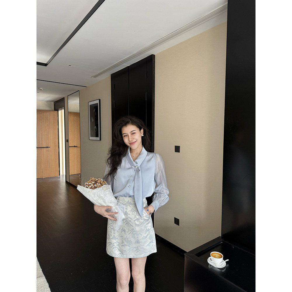 新中式 张阿星 蓝色飘带质感衬衫 法式 国风提花高腰半裙 天空之境