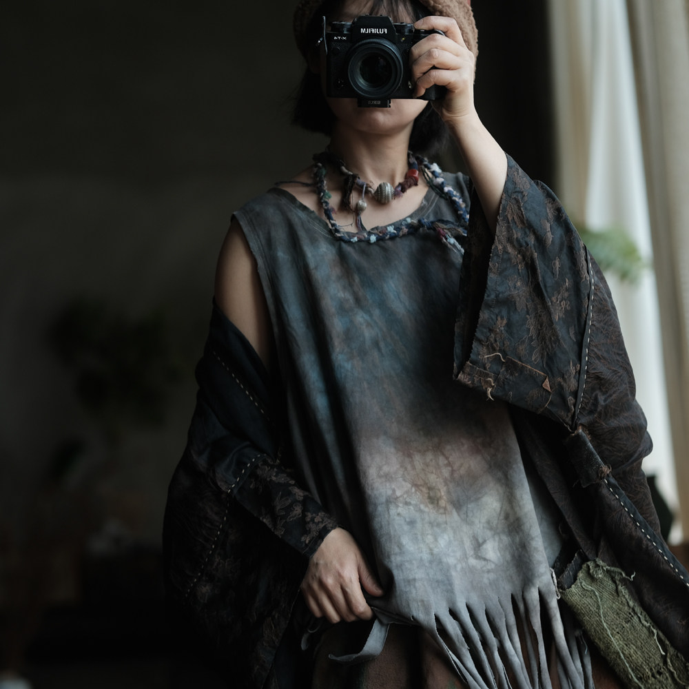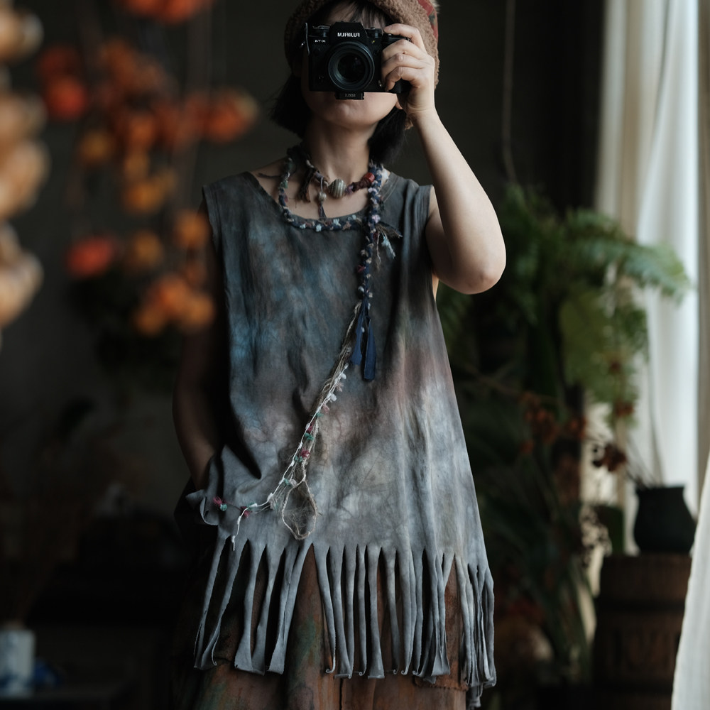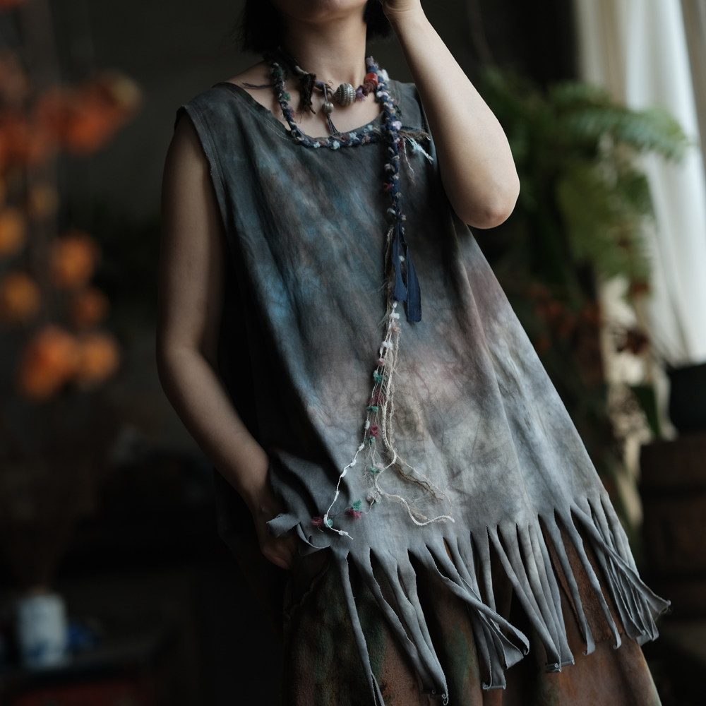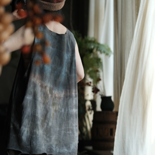 复古手工植物染棉料圆领背心马夹坎肩2368灰调