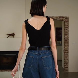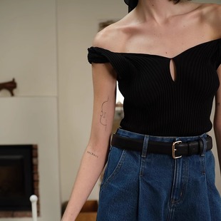 TOP家优美线条 复古时髦简约露肩扭结一字领设计显瘦针织上衣 法式